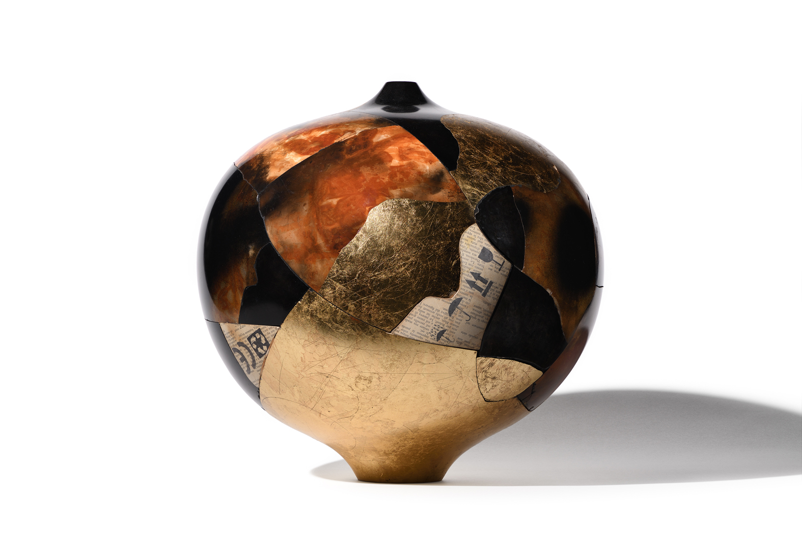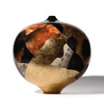 La deliberata opera di frantumazione e la successiva ricostruzione, in sincretismo con materiali estranei, esalta l’essenza del recipiente che perde così la sua qualità più caratterizzante, per rivelarsi in una nuova configurazione. Resta la sagoma del vaso, resta la struttura sottolineata dalle cicatrici dei frammenti, ma è un profilo che, dall’unione di brani di materie diverse, manifesta una nuova essenza.