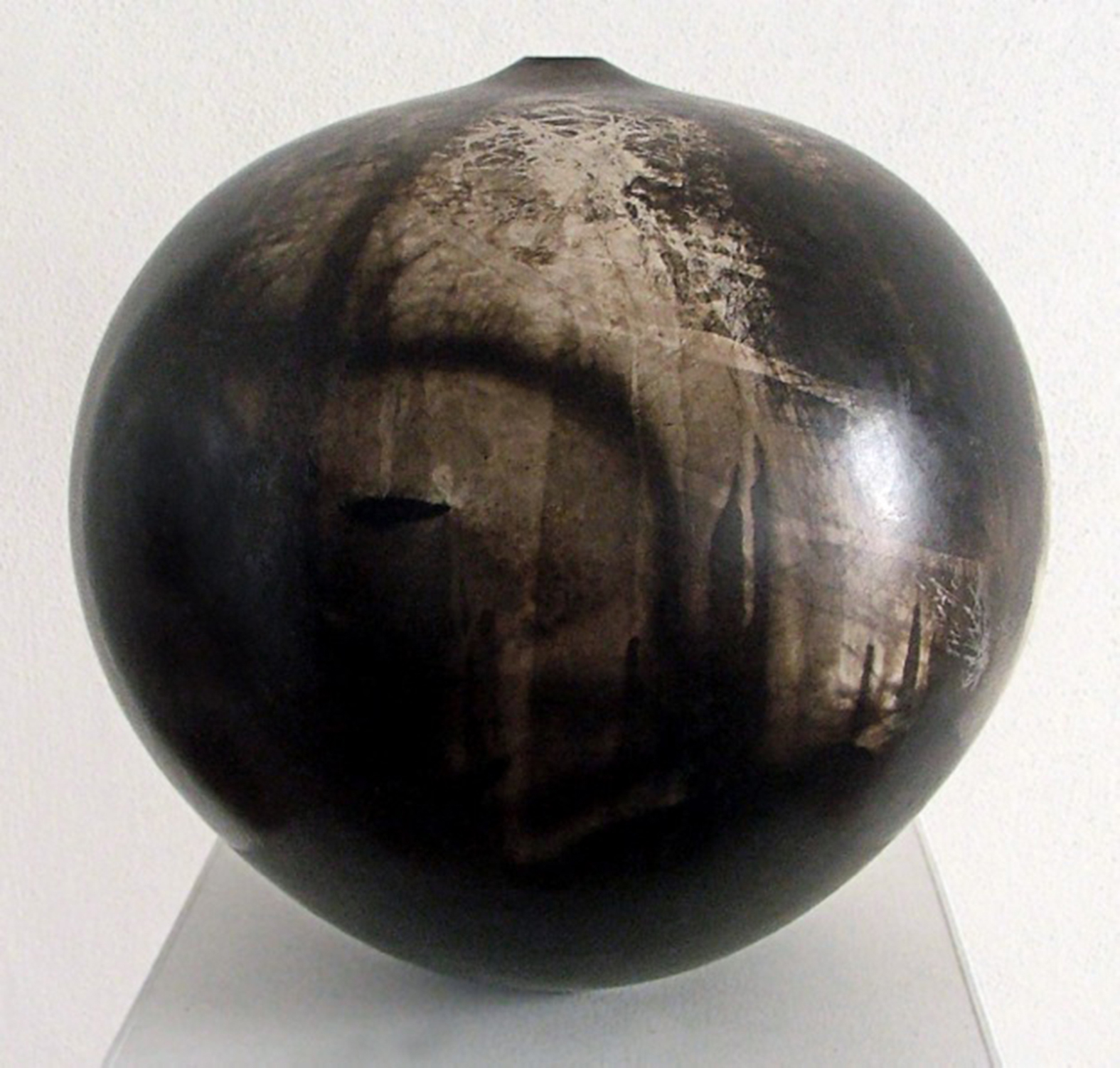 Ecco dunque i grandi “cerchi murari” nei quali, per la prima volta, sottili elementi frammentari divengono materia solida. Al centro dell’esposizione spiccano i “vasi non vasi” a sfera prettamente ceramici che, da una prima raffinatissima foggiatura della materia e da un’iniziale ricercato lavoro di cottura e affumicatura, si spingono fino all’esito estremo: la loro disgregazione.
