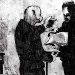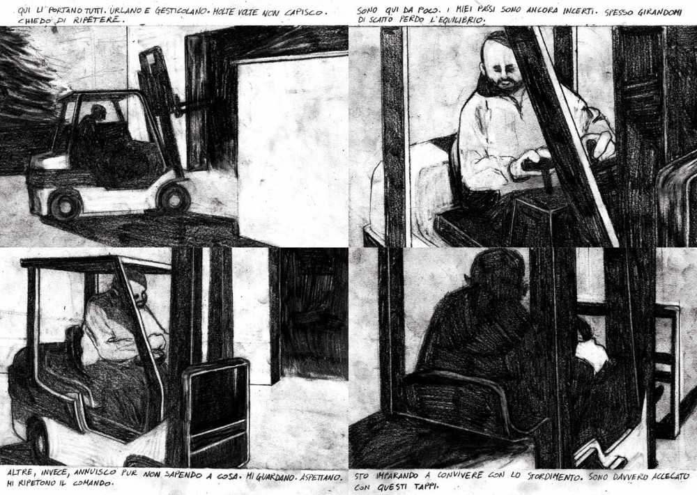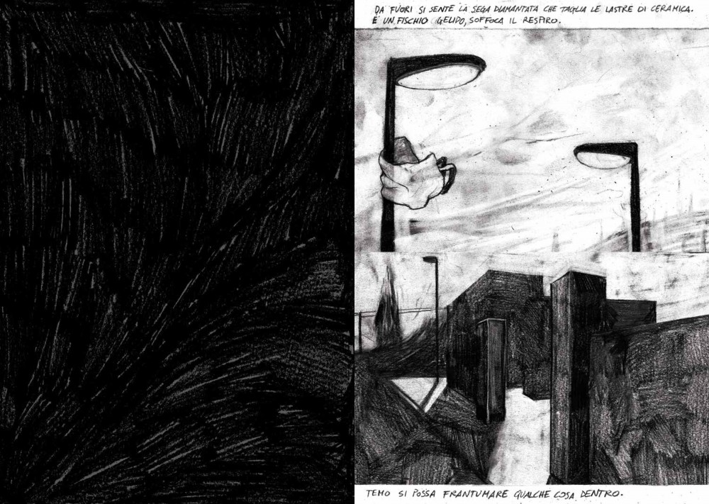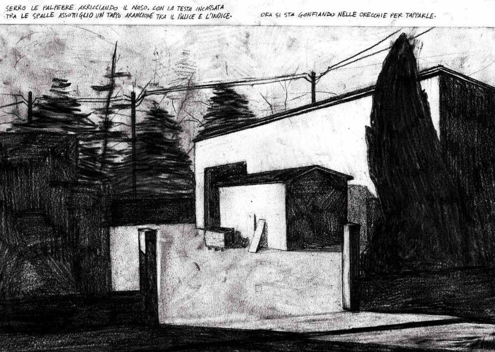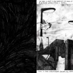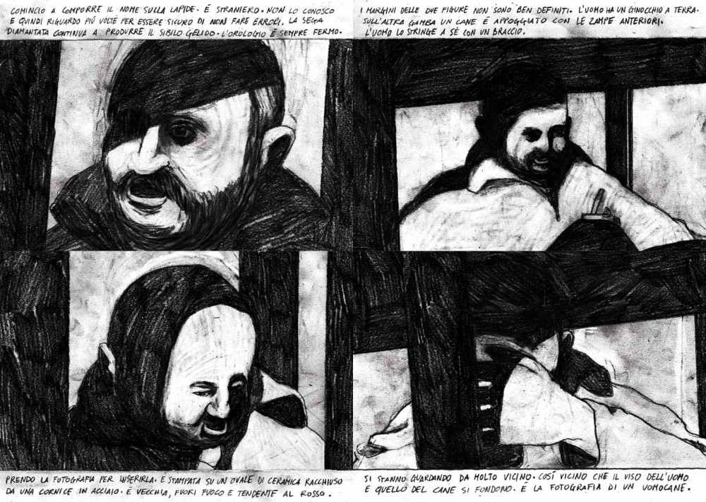 La mostra di Samuele Canestrari nasce da una selezione di disegni tratti dalla omonima graphic novel Gli uominicane non hanno la coda edita da “Libri Somari”, realtà indipendente creata dallo stesso Canestrari con l’amico fumettista Ahmed Ben Nessib. Le immagini, isolate sul foglio, ci affronteranno e le affronteremo in silenzio. Il reticolo di disegnatori legati l’uno all’altro è fitto fitto, perché il mondo degli autori per immagini e testo, matita e grafite, è uno dei più interconnessi e più avvezzi all’avvicendamento.