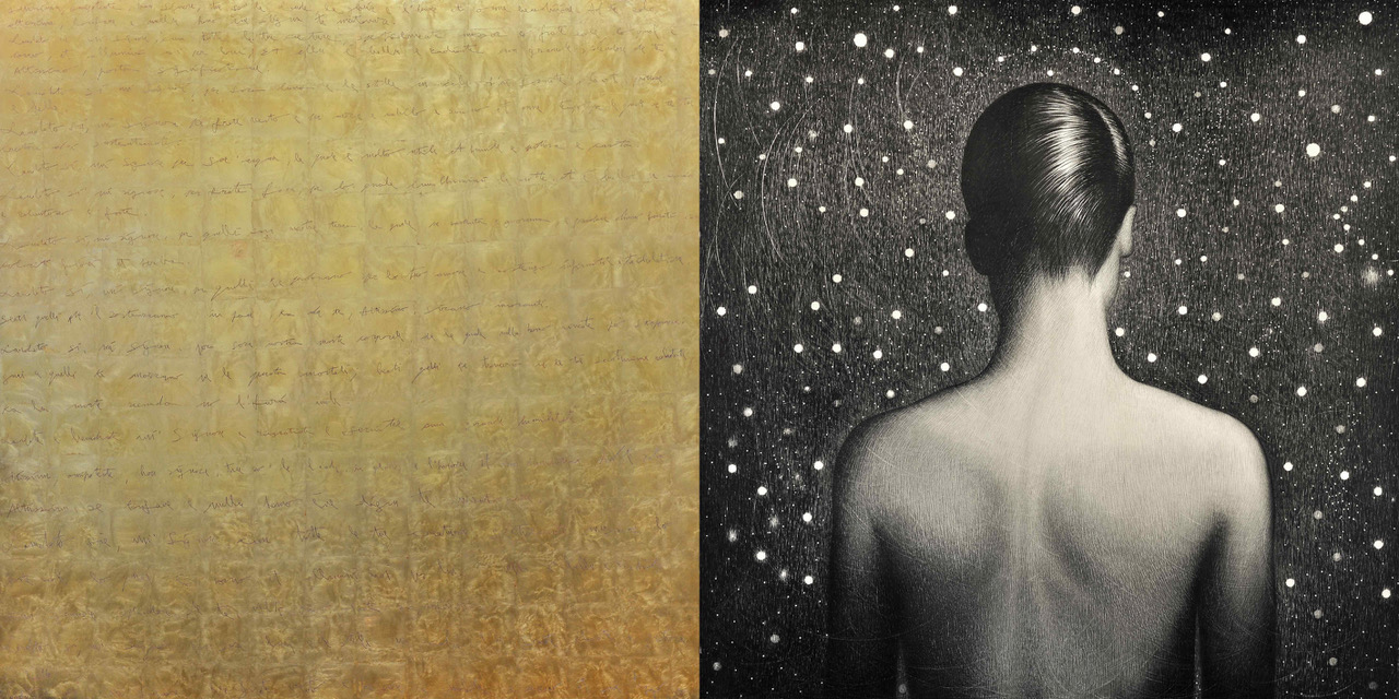 L’ormai celebre Venere degli stracci di Michelangelo Pistoletto è una riflessione sull’equilibrio tra natura e artificio presente; Emilio Isgrò si è confrontato direttamente con il Santo, applicando le sue note cancellature concettuali, che non vietano o distruggono ma proteggono le parole, anche al Cantico delle Creature; come pure il dittico In Lumine Dei di Omar Galliani è un omaggio diretto al Cantico, inciso sulla superficie dorata di una delle due tavole a cui si accosta una figura di donna di spalle in un’ opera che si interroga sull’esperienza del divino e in cui, come nel dettato francescano, la luce non è oggetto di contemplazione, ma presenza diffusa che attraversa ogni forma del vivente, rendendo il corpo spazio di risonanza, di accoglienza e di possibile manifestazione del sacro.