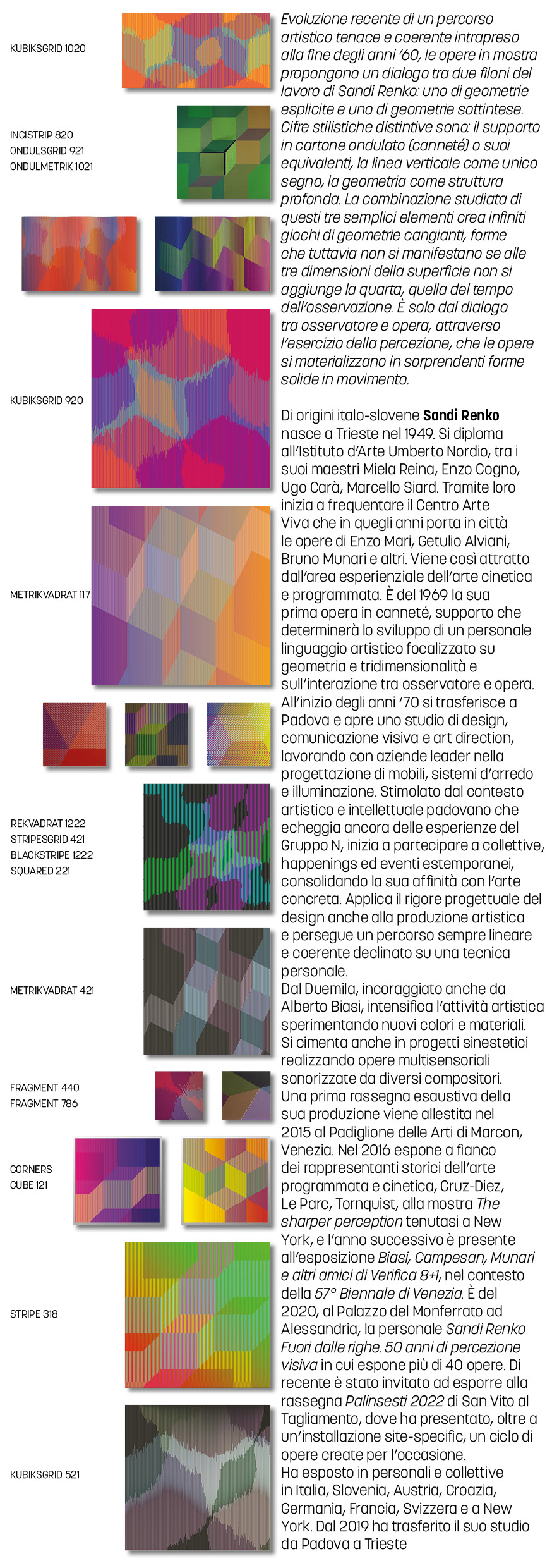 Sandi Renko, artista e designer, opera fin dalla fine degli anni ’60 nell’ambito dell’arte cinetica e programmata. E’ del 1969 la sua prima opera su cartone ondulato, supporto che determina un linguaggio focalizzato su geometria e tridimensionalità e sull’interazione tra osservatore e opera