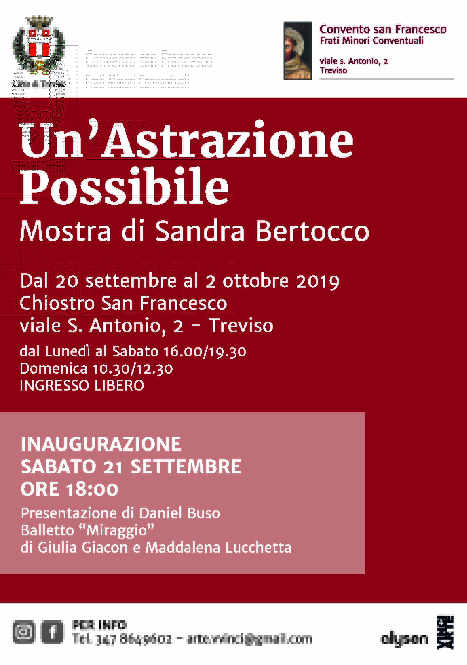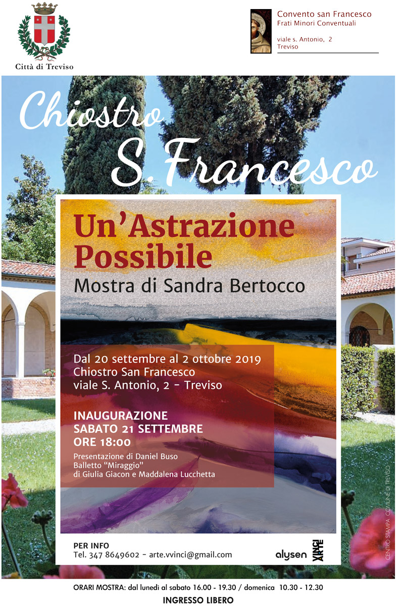 La Mostra dell’artista padovana Sandra Bertocco dal titolo ‘Un’Astrazione Possibile’ si terrà presso il Chiostro San Francesco in viale S.Antonio, 2 a Treviso, dal 20 settembre al 2 ottobre 2019. Presentazione a cura di Daniel Buso.