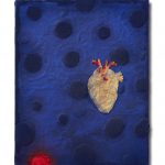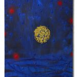 Come non riconoscere, nei segni che attraversano quel blu, il movimento delle onde, delle correnti? Nelle sue macchie di rosso, la traccia di una ferita che ogni giorno si rinnova, ma anche la metafora di una speranza che non cessa di essere coltivata? Nei suoi ori, la metafora ulteriore di un altrove da immaginare, e da inventare? Nei suoi cuori sospesi la rappresentazione del viaggio e dell’esilio – intesi come vite in bilico, provvisorie, precarie, prive di terra sotto i piedi”.