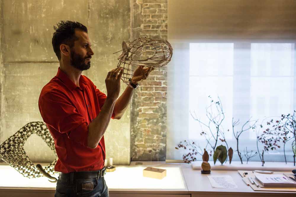 Non si tratta mai di uno stravolgimento, ma di una sincronia di tempo e di spazio che permette alle sue installazioni di arricchire ciò che c’era, alterando la percezione comune e regalando un ricordo indelebile. Una ricerca che si sviluppa in geometrie - rassicuranti elaborazioni per la parte razionale di ognuno di noi - che non necessitano di “riempire i vuoti”, che vivono di trasparenze e di aria. Strutture concrete di legno, ferro o pelle, che aggiungono alla loro forma le forme circostanti, che si colorano dei colori che le circondano” scrive la curatrice Laura Orlandi.