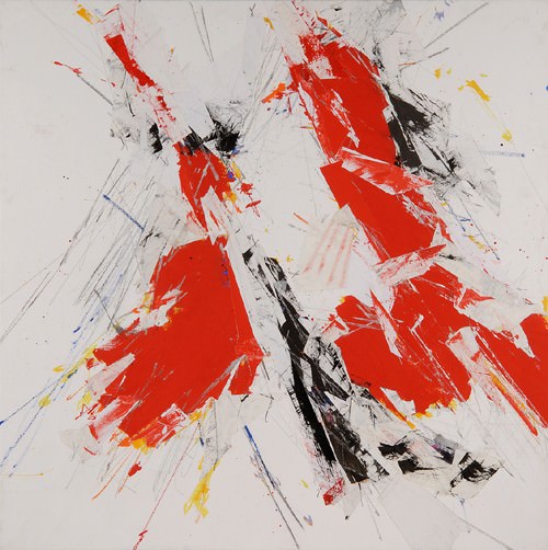 Scrive Domenico D’Oora: ”La superficie dell’opera è animata da un’invasione di schegge, graffiti - anche brandelli fisici di stoffe, ma pur sempre verosimili lacerti di una colossale dèbacle di un’epoca o di un desiderato, imminente riscatto- che sono mossi da una fortissima volontà, forse rivoluzionaria, forse nostalgica, che ha l’apparenza di escludere ogni intrappolante ragionevolezza e non accettare di approdare ad un che di predefinito e che, nel proprio sconfinamento nello spazio, sembra cerchi, in un’interrogazione, in un’ipotesi, una qual possibile necessaria rottura, imprescindibile via di affrancamento e riscossa.
