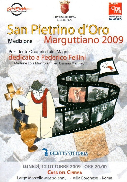 Lunedì 12 ottobre 2009, alla Casa del Cinema a Villa Borghese, Largo Marcello Mastroianni, 1, nella Sala Deluxe, alle ore 20.00, si terrà la IV edizione del Sanpietrino d’oro Marguttiano, quest’anno dedicata al Maestro Federico Fellini.