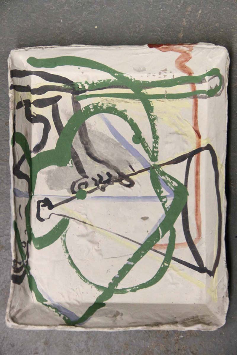 The piece can be fired up to four or five times and undergo various types of “shock” according to the materials, the order of application, and the temperature of the kiln. The effect caused by the various transitions can sometimes be unpredictable, giving the artist the sensation that it is the material itself that defines the way of conceiving the finished work. The themes of the wall drawings depict some of the stages that are no longer visible in the ceramics and that would be lost unless the artist had not decided to record them again through painting. At the same time, the use of everyday objects such as plates and wooden moulds bear traces of those who have used them, wear, humidity and a change of temperature, while the writing, taken from the word games of street slang and half forgotten notes, embraces the possibilities offered by the interruption and manipulation of meaning, generating unchecked energy based on errors and accidents.