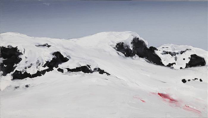 Completano la mostra una serie di paesaggi innevati, che riprendono le tonalità cromatiche dei volti, e raffigurano orizzonti candidi segnati da improvvisi squarci di rosso.