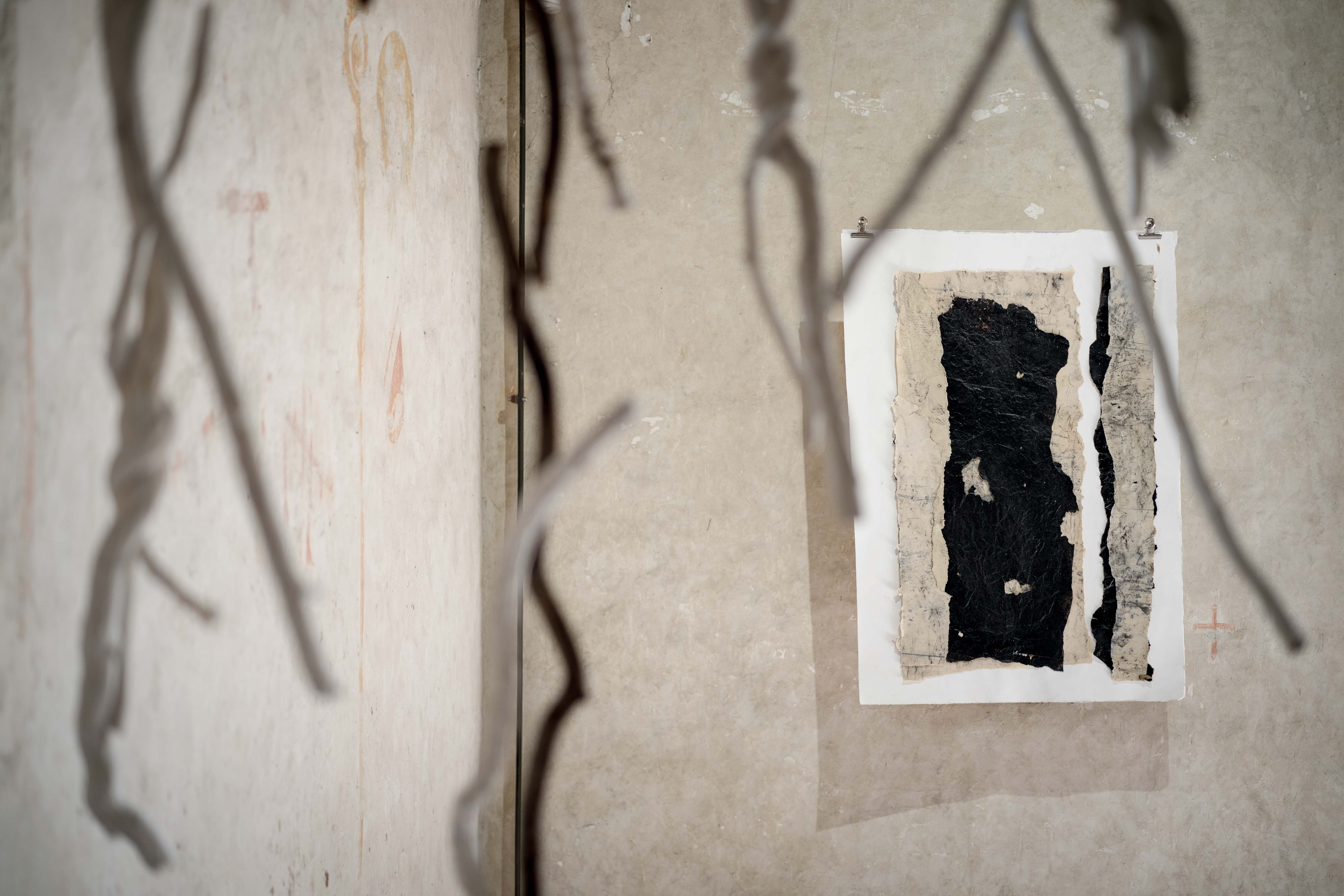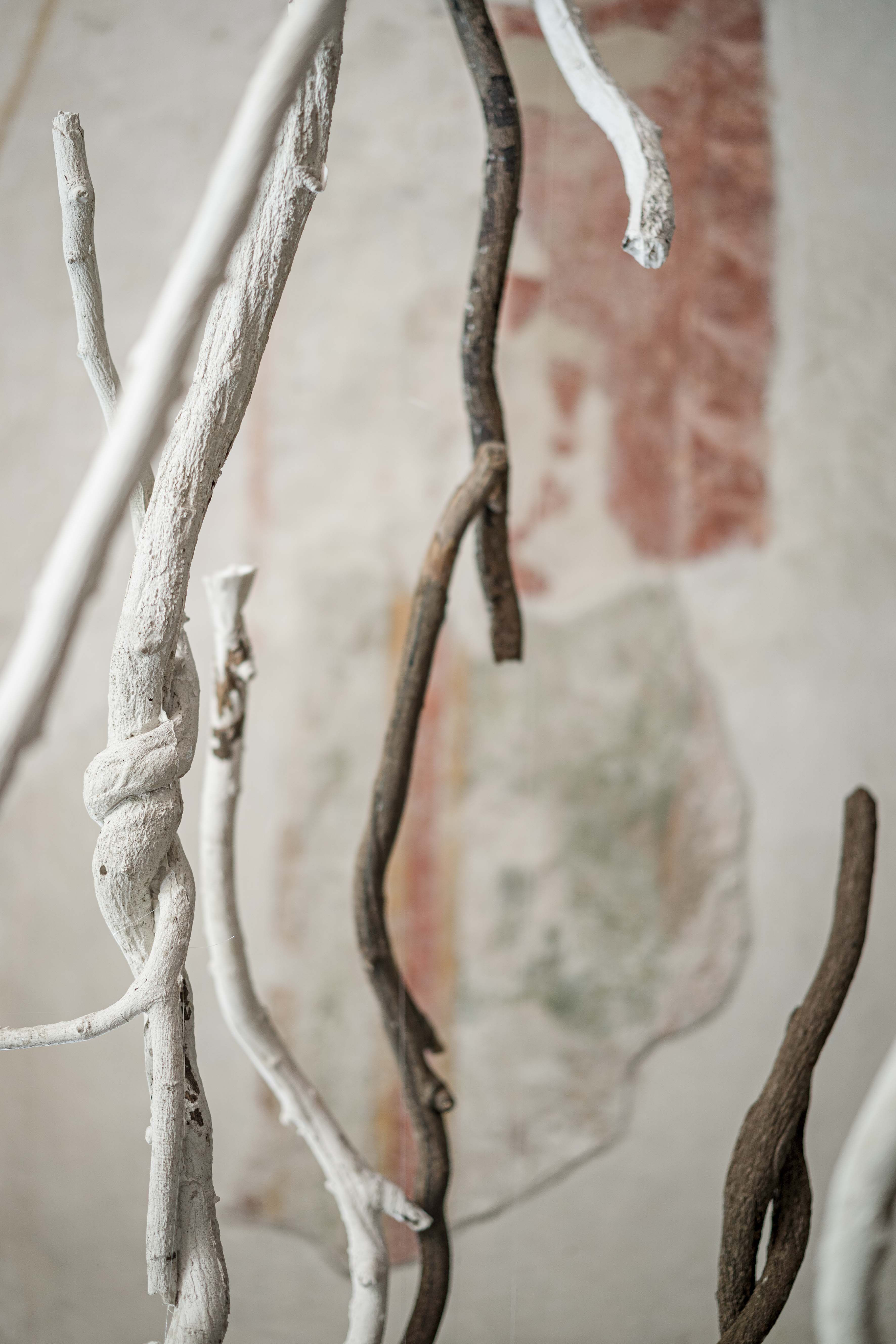 Dell’installazione fanno parte un disegno a carboncino come pala d’altare, dei collage ispirati alla forma del glicine, i calchi che testimoniano una delle fasi del processo di ottenimento dei positivi, e le sculture di resina di alcuni rami della pianta. Questi ultimi, appesi al soffitto ci ricordano le potature e le mutilazioni che la pianta ha iniziato a subire prima del taglio totale.