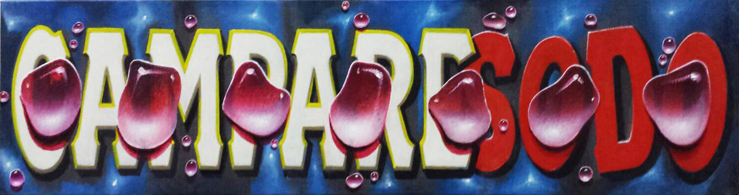 Santolo De Luca, in questo caso, cambiando semplicemente due vocali, ci mette di fronte ad altre due parole: “Campare Sodo”, con un nuovo significato e in tutt’altra prospettiva, parole non scritte ma dipinte tra la loro stessa punteggiatura, bagnate di gocce rosso Campari, di rosso vita o rosso vitale come sangue, o meglio ancora, di rosso Campare.