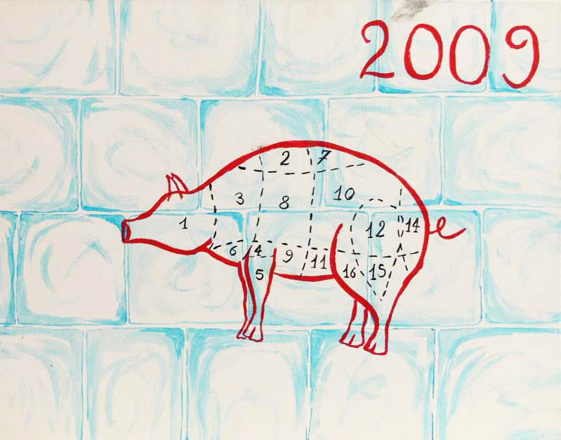 Caratteristiche neo dada presenta l’opera “Filling bottle” di Matthew Constance, in cui l’oggetto bicchiere diviene il tramite simbolico della saturazione e del colmo della misura; mentre Erica Motta in “Liquido” opera una de-contestualizzazione dell’oggetto reinterpretandolo in una marcata riduzione d’uso, realizzando un’opera a metà strada tra ready-made e arte povera. Vanessa Anzoni dipinge un Lady Godiva, l’opera per le caratteristiche puramente esteriori e l’annullamento critico di ogni soggettività nella rappresentazione, rivisita il linguaggio della Pop Art. continuando sulla stessa linea Ciro Casale riprende il linguaggio specifico dei cartelli informativi dei supermercati, proponendo l’analisi descrittiva delle parti che compongono l’animale macellato in cui il suo corpo-puzzle numerato si sovrappone e confonde con il frazionamento dello sfondo creando una mappa capziosa dei sapori.