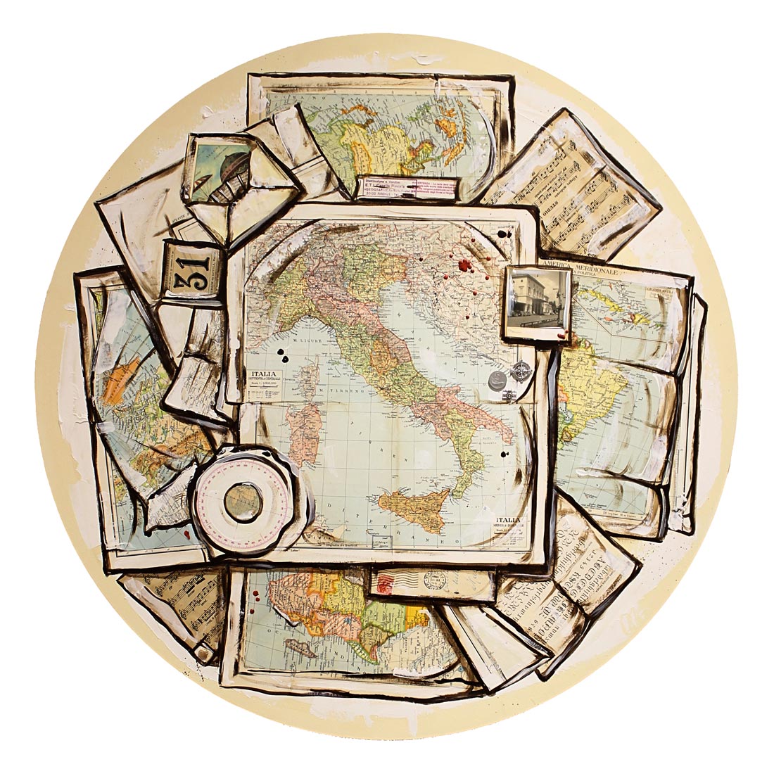 Nelle sue opere, mappe nautiche originali convivono con frammenti di libri musicali, cartoline, francobolli, piccoli oggetti e reliquie del quotidiano. Ogni elemento conserva un passato e una memoria, ma nell’assemblaggio proposto dall’artista diventa parte di un nuovo linguaggio. Non semplici residui, bensì coordinate di un percorso inedito: geografie ridisegnate in cui la navigazione è possibile anche tra scrittura e natura, poesia e ricordo, viaggio reale e immaginazione, sapienza e conoscenza.