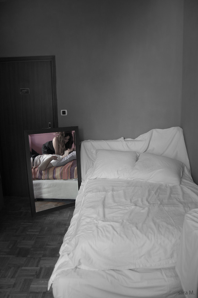 Lo specchio è il mezzo scelto dall’artista per farci intraprendere questo straordinario viaggio della memoria: “attraverso lo specchio” si accede a dimensioni altre, dell’inconscio, del sogno, della fantasia. C’è una sottile malinconia nel vuoto di queste stanze intime, nei ricordi personali delicatamente raccontati. Le scarpe con i tacchi alti sono ancora presenti nella stanza ma non si specchiano, un accessorio di seduzione femminile che svanisce, come sono svanite le scene d’amore sul piccolo letto bianco. Eppure esse riappaiono nella memoria e si ripresentano nello specchio. C’è una purezza nel sentimento, nel ricordo d’amore, una leggerezza trasognata, un tempo sospeso verso l’infinito.