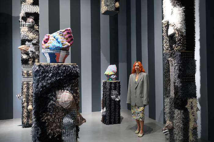 Il nuovo corpus di opere, creato dall’artista nel corso del 2023, presenta 7 fantasmatiche figure simili a colonne di pietra. Alcune si ergono verso l’alto, altre si calano dal soffitto componendo un coro di rovine. Il loro status di strutture statiche e monumentali è messo in discussione da superfici soffici e dinamiche che sembrano in continuo divenire. L’artista considera la tessitura come un materiale, ma anche come un processo: qualcosa che continua a evolversi mentre esce dal telaio. In cima, le colonne sono abitate da misteriose sculture ispirate alle mummie di Paracas, una pratica tipica delle civiltà precolombiane.