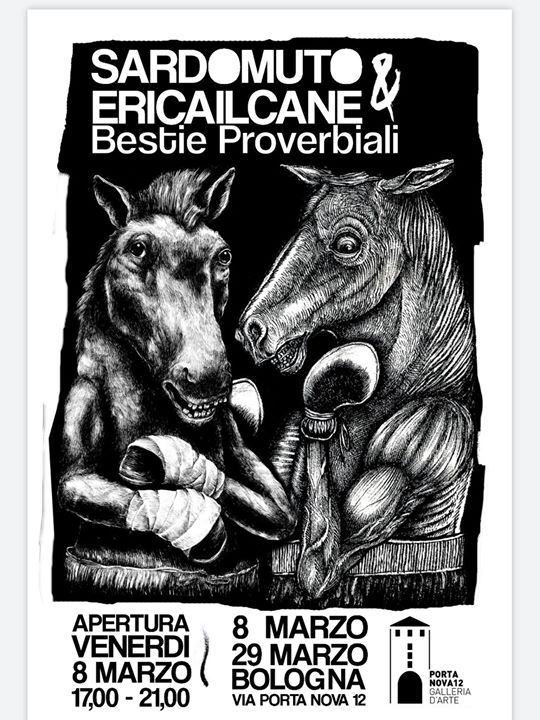Vizi e virtù umani contaminano l’istinto animale e ne compromettono la naturalezza: gli animali protagonisti delle illustrazioni di SARDOMUTO ed ERICAILCANE si immergono nella società, si relazionano e reagiscono all’ambiente circostante, portando addosso il fardello degli essere umani, influenzando detti e proverbi popolari. La maggior parte delle opere proposte nella ricca esposizione di disegni presenti, sono confluite nella realizzazione di un avvincente progetto editoriale (autoprodotto dagli artisti stessi) che esplora nella fattispecie il Genius Loci della Sardegna ( SARDOMUTO ) e quello della Colombia (ERICAILCANE). Verranno inoltre esposte altre tavole di vario formato, alcune disegnate in collaborazione, che sempre però ricorrono alla stessa scelta di mezzi popolari (Grafite e penne pigmentate) e all’imperante contrasto del bianco e nero, congeniale a entrambi gli autori, per comporre una raffinata ed evocativa atmosfera proverbiale in cui le figure del mondo animale vengon corrotte dalla bestia Uomo
