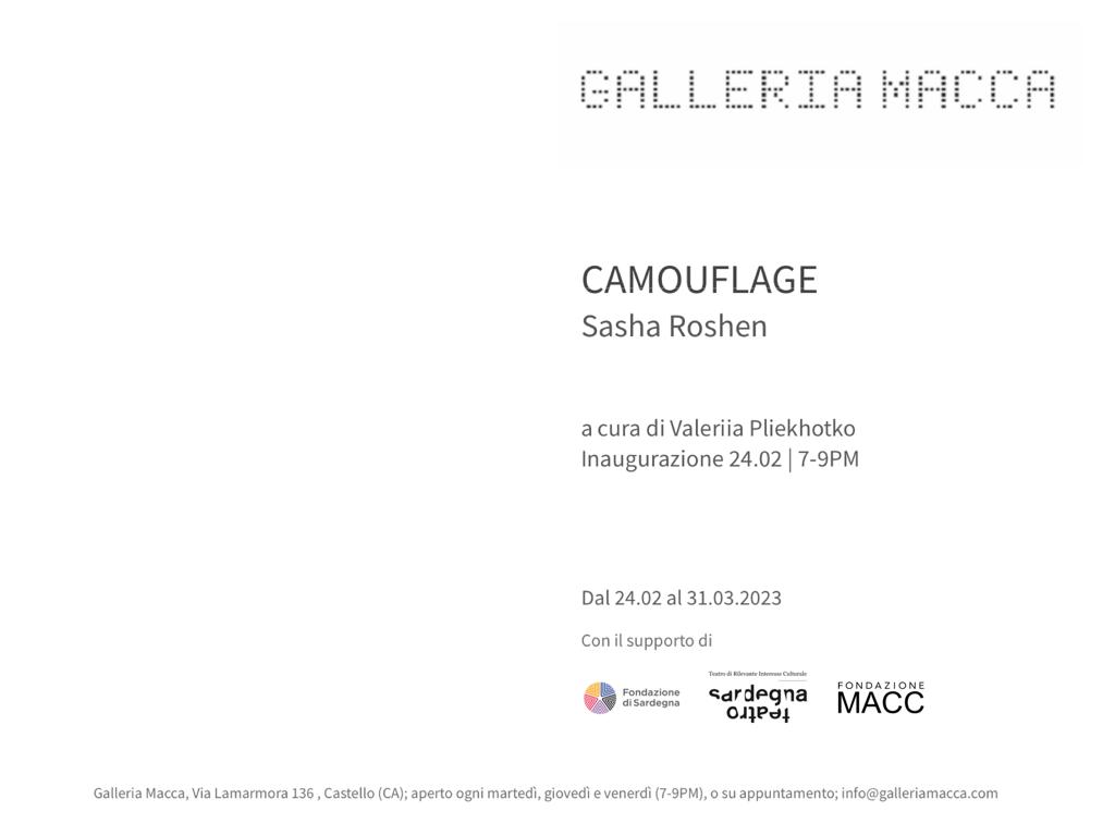 Galleria Macca è lieta di presentare Camouflage, di Sasha Roshen (Kharkiv, 1996) a cura di Valeriia Pliekhotko (Odessa, 1996), Curatore Indipendente. La mostra sarà visitabile dal 24 febbraio al 31 marzo, ogni martedì, giovedì e venerdì dalle 19 alle 21, o su appuntamento. Ringraziamo Fondazione di Sardegna, Sardegna Teatro, e Fondazione MACC per il prezioso supporto.
