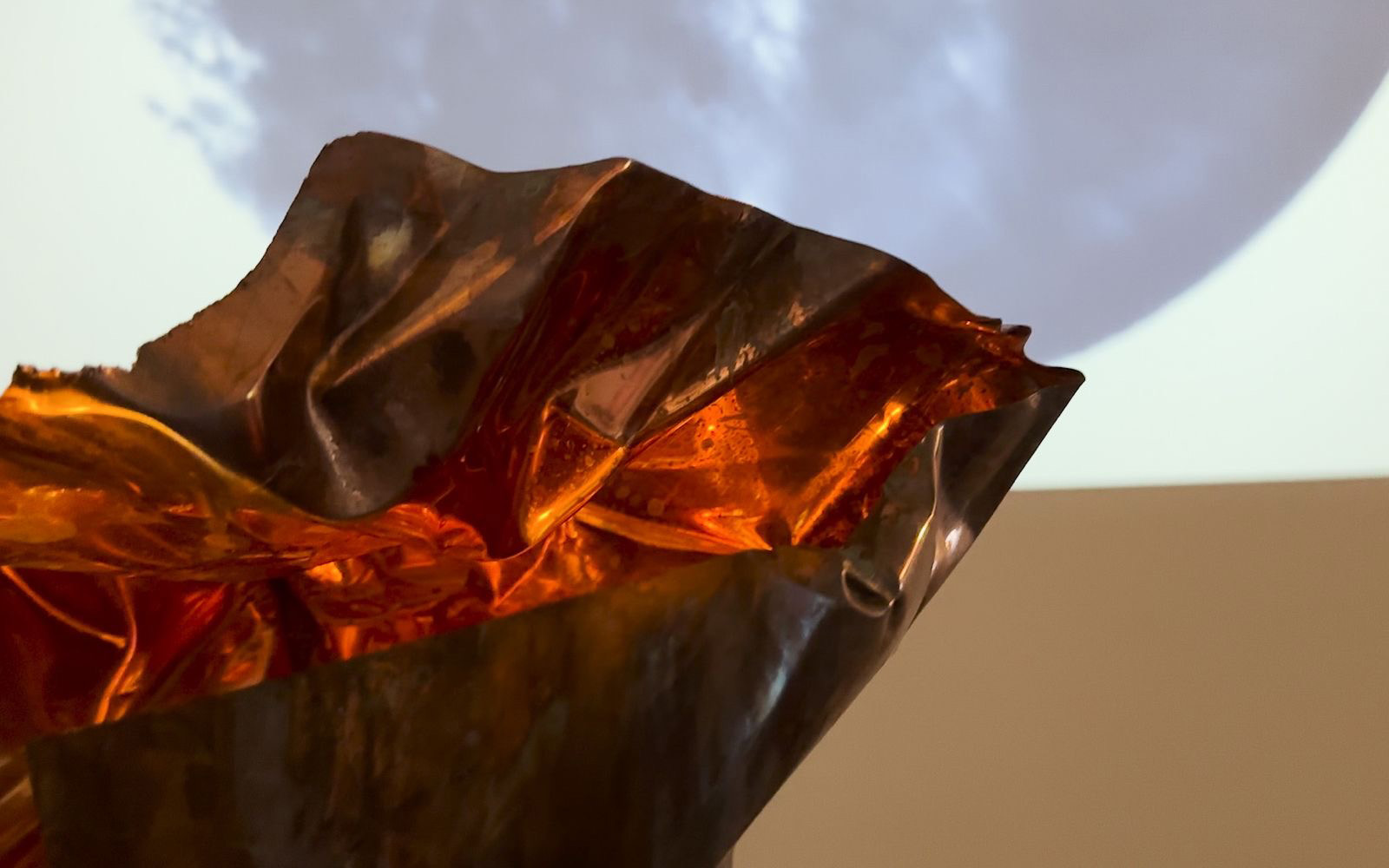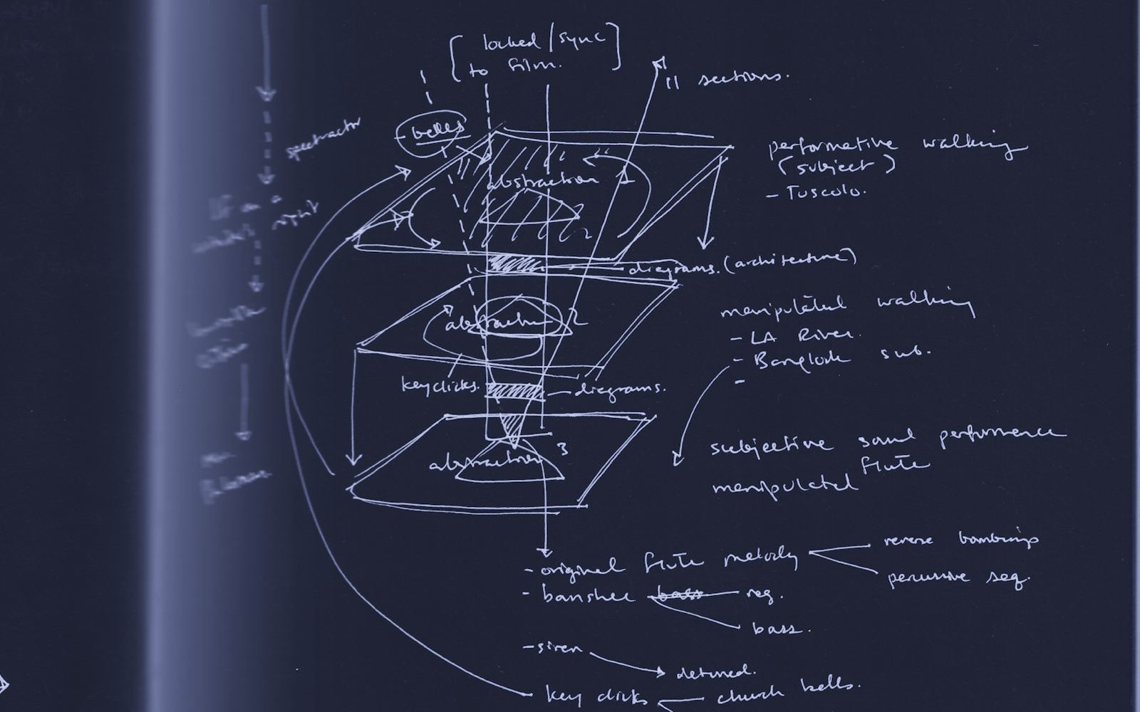 Questa mostra si confronta con tre romanzi di Italo Calvino—Se una notte d'inverno un viaggiatore, Le città invisibili e Palomar—oltre che le tre città che hanno segnato il mio personale percorso verso questa mostra: Bangkok, Los Angeles, Roma. L’installazione intreccia il visivo ed il sonoro, l'effimero ed il fisico, utilizzando una configurazione tripticale e scalabile, piegando e dispiegando ogni strato, dalle impronte sonore delle città, alla video-installazione performativa e relazionalmente-modulare (1), alle tre sculture sonore in rame. I suoni stessi sono creati dai gesti performativi dei partecipanti sui social provenienti da tutte e tre le città, dalla flautista Cari Ann Souter e da me stesso,