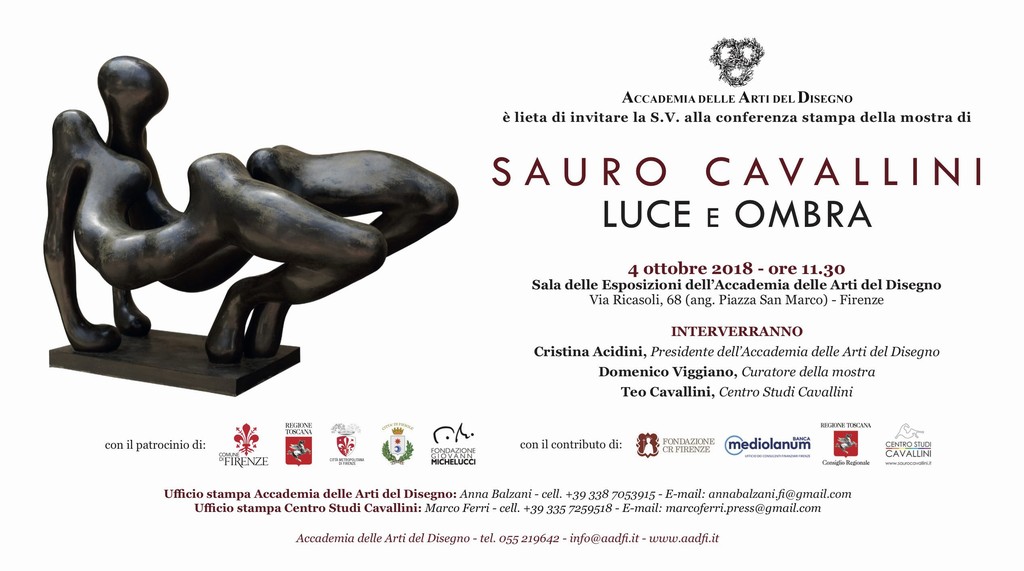 A distanza di poco più di due anni dalla sua scomparsa, l’artista Sauro Cavallini sarà protagonista di una grande mostra nella Sala delle Esposizioni dell’Accademia delle Arti del Disegno, in via Ricasoli 68, a Firenze. Con il titolo “Sauro Cavallini – Luce e Ombra”, la mostra antologica curata da Domenico Viggiano si inaugurerà giovedì 4 ottobre 2018 alle ore 17.30, proponendo l’intera parabola artistica di Cavallini: dalle prime creazioni di grafica degli anni ‘60 alle grandi sculture in ferro e bronzo, fino alle tempere dell’ultimo, prolifico periodo.