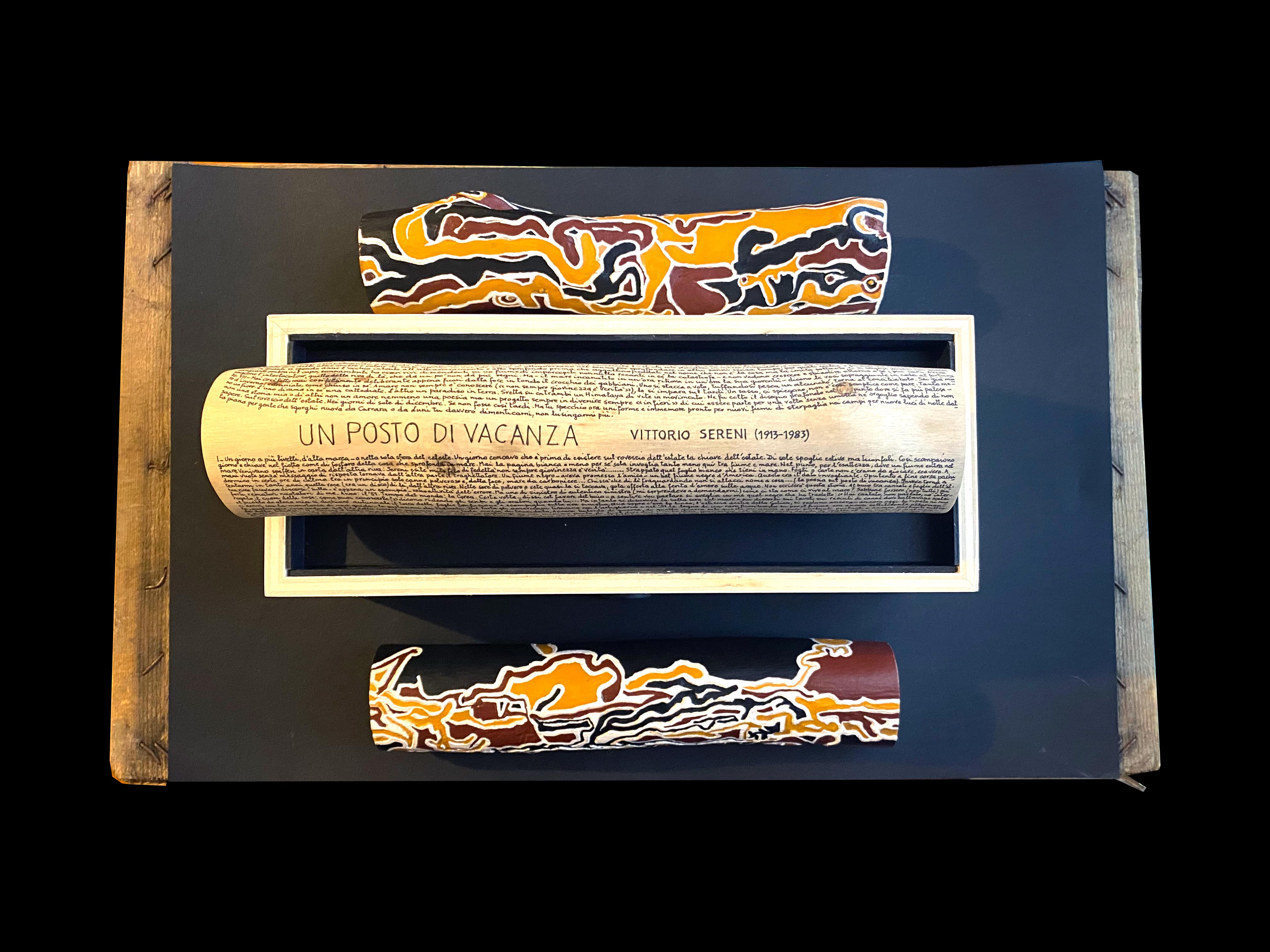 Nelle opere di Sergio Marchesini (1946) trapelano la sacralità della parola scritta e il valore della storia e della memoria attraverso di essa. L’esposizione prevede una trentina di opere tra tronchi scritti, tronchi dipinti ispirati all’arte aborigena australiana ed alcuni divertissement.