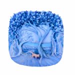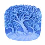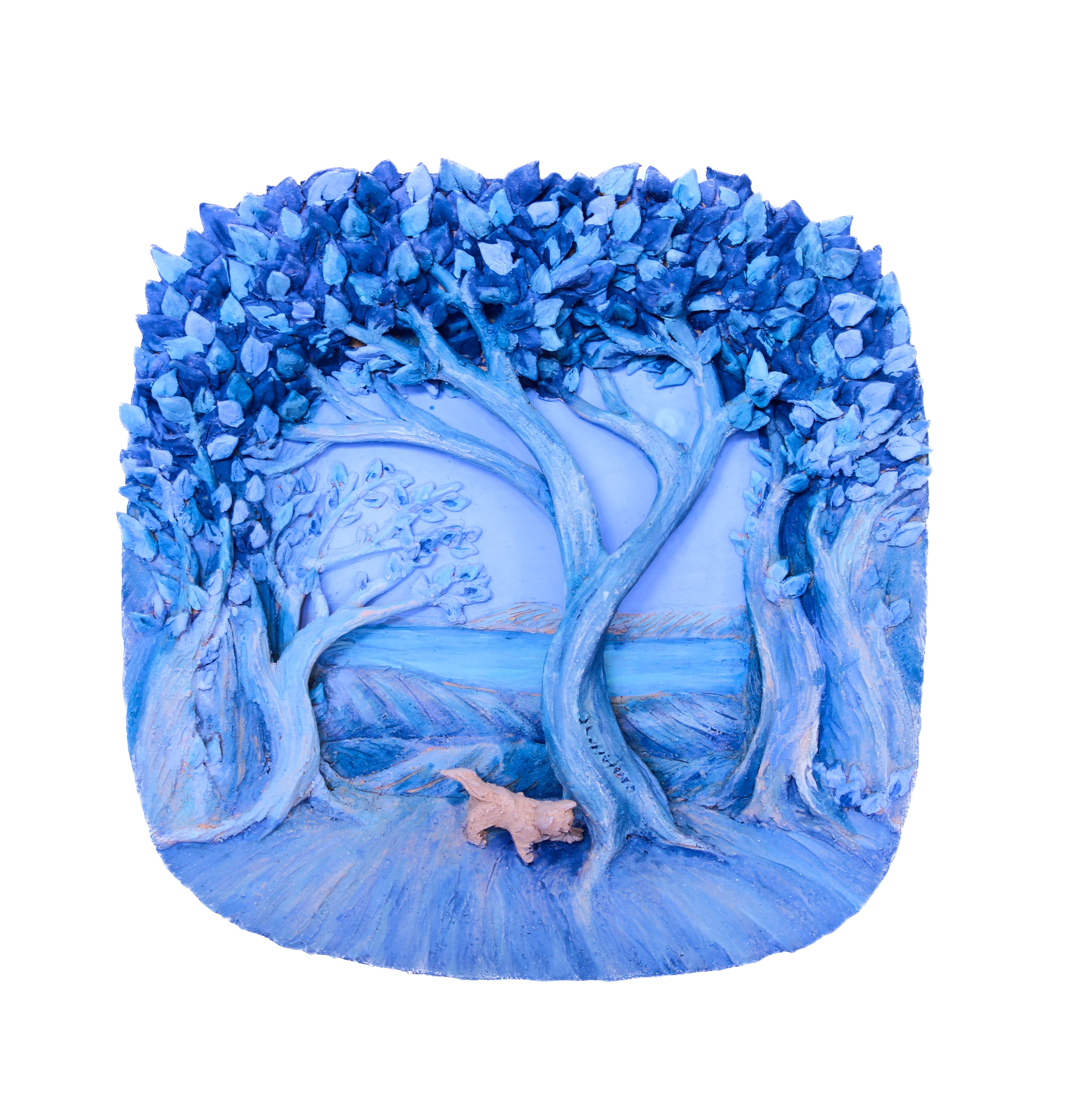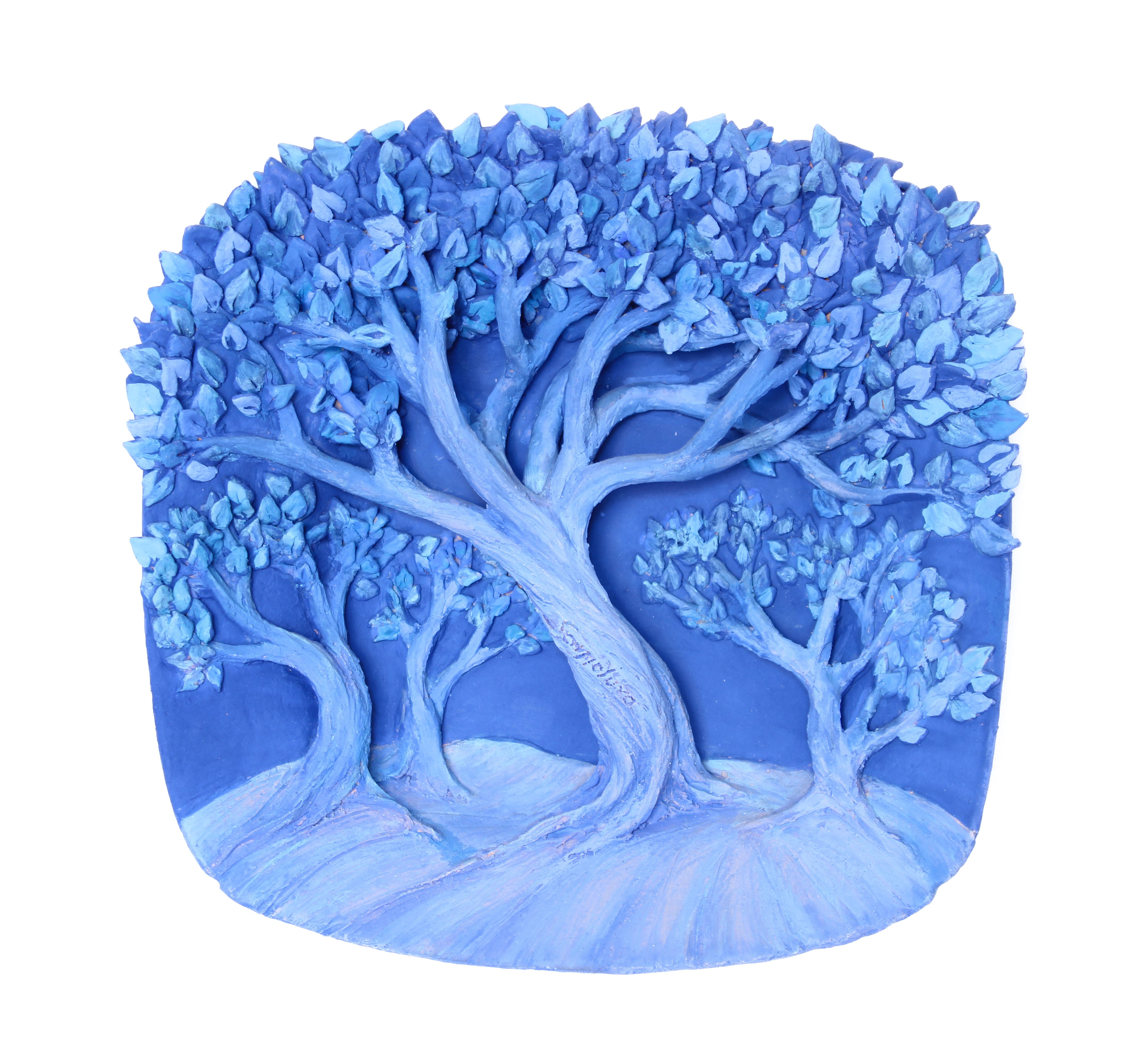 L’albero, tema ricorrente dell’artista che viene qui proposto in bassorilievo e a tutto tondo, ha grandi rami e foglie colorati d’azzurro per meglio confondersi con il cielo sereno.