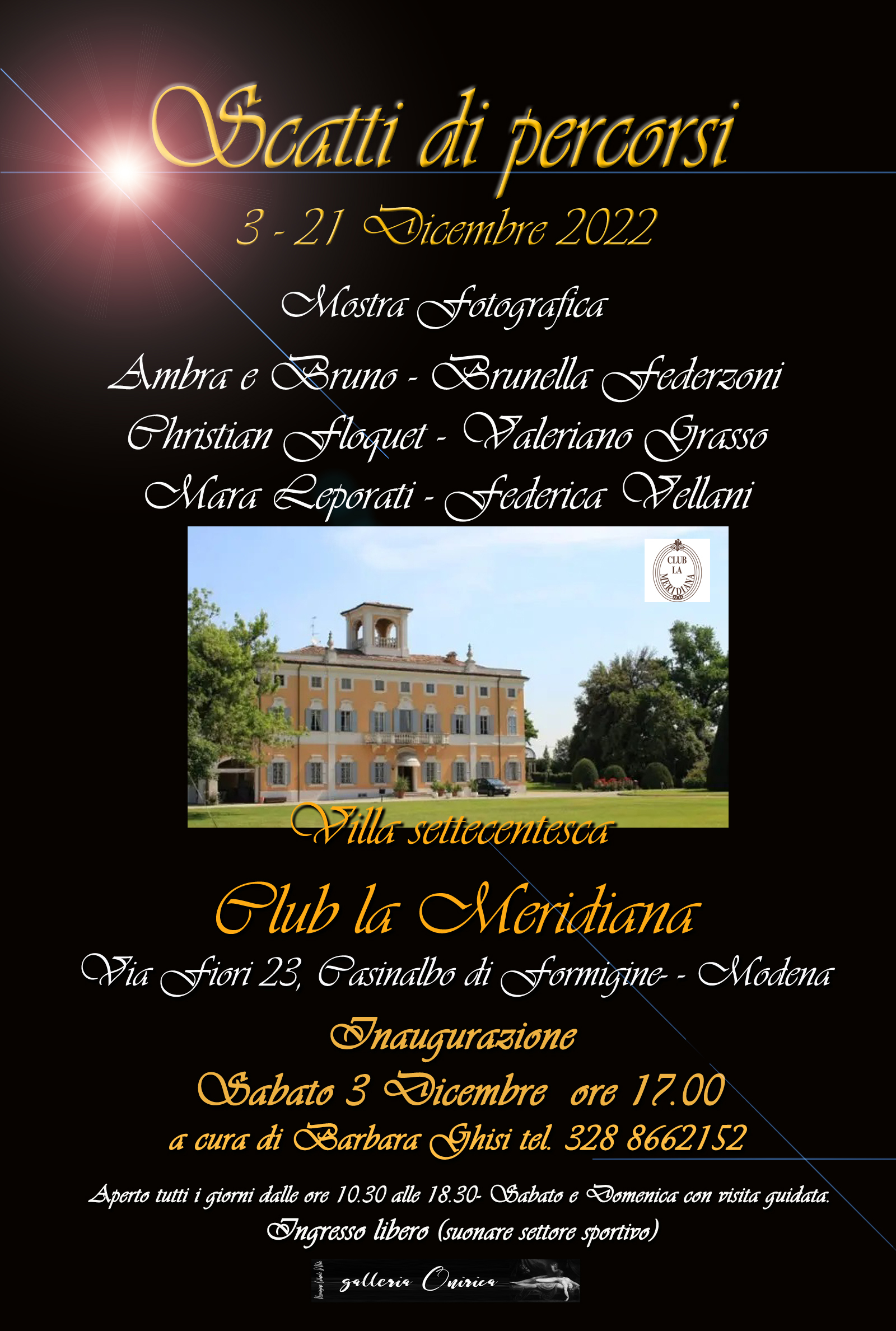 Ricerca è la parola che emerge visitando la mostra fotografica Scatti di percorsi che inaugura sabato 3 Dicembre alle ore 17.00 nella villa settecentesca del Club La Meridiana a Casinalbo di Formigine. Tra i protagonisti modenesi Ambra Turra e Bruno Ghirarduzzi due romantici sognatori che ricercano costantemente la bellezza ovunque. Appassionati entrambi di archeologia urbana, attraverso la loro serie di scatti Memorie di cristallo, catturano i luoghi abbandonati di una buona parte dell’Italia. Indagando il fascino del mistero e del racconto di storie spesso dimenticate, ad oggi hanno percorso circa 45.000 km visitando ex ospedali psichiatrici, conventi, chiese sconsacrate, industrie dismesse, antiche ville nobiliari abbandonate etc. Federica Vellani diplomata all’Istituto d’Arte Venturi di Modena in Grafica e Fotografia, nel 1998 apre uno studio fotografico ed inizia a trasmettere sensazioni attraverso ritratti artistici dal fermo immagine sbalorditivo. Oggi è titolare di un centro stampa e fotografia a Modena. Per il suo amore verso il regno animale e in primis per cani e gatti, si dedica ad un nuovo progetto di ritrattistica dal titolo Pets. Le amiche Brunella Federzoni e Mara Leporati hanno scoperto la passione per la fotografia in un viaggio in Serengeti nel 2018, guidato da Pierluigi Rizzato. La prima ha iniziato da subito scattando attraverso il mezzo digitale ed ha optato per una ricerca approfondita della natura e della vita dei Felini. La seconda, carpigiana di nascita, scattava foto in analogico già dal 1990. Oggi, passata al digitale, propone la serie Autentici Maasai che indaga, al di fuori delle classiche rotte turistiche, la vita di un popolo nel suo ambiente abituale, puntando a cogliere l’attimo unico e fuggente di uno sguardo, di un’azione o di un gesto istintivo, in modo da comporre un racconto visivo. Tra i protagonisti fuori Modena abbiamo Christian J. Floquet. Cresciuto in Argentina risiede da 16 anni a Milano, ed è traduttore di professione per istituzioni italiane ed europee. Per lui l’amore per la foto nasce da bambino quando inizia a portare le macchine fotografiche del papà, diplomatico francese, nei vari viaggi. Dal 1980 in poi si sposta tra Buenos Aires e Parigi cominciando ad interessarsi alle architetture e documentando le grandi opere in costruzione. Oggi sulle tracce dei suoi fotografi preferiti, come Gabriele Basilico, gira a fotografare la vecchia Milano ma anche le nuove architetture di cui la città è ricca. La sua ricerca della serie Coup d’œil getta “uno sguardo” sulle città attraverso particolari delle architetture, come tessere di un grande puzzle. Chiude il gruppo il ragusano Valeriano Grasso, con la serie Viaggio in Sicilia. Nel 2019 una sua foto è stata inserita nel Best 150 B&W dalla Lens Culture di New York e, Giovanni Gastel scrive il piatto posteriore della sua raccolta Media Aetas. Seguono pubblicazioni in riviste quali Vogue, Art of Nude, Artells. Nel 2021 al concorso Fiducia e speranza nel futuro, una sua foto viene selezionata da Nino Migliori e depositata dalla FIAF nella rivista Riflessioni, inserendolo nel Centro Italiano Della Fotografia d’Autore. Attualmente cura un corso di fotografia creativa all’Università di Bologna, città dove si è laureato. La mostra resterà aperta tutti giorni fino al 21 Dicembre, dalle 10.30 alle 18.30, sabato e domenica anche con visita guidata dalla curatrice Barbara Ghisi. Info tel. 328 8662152
