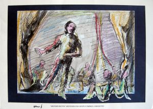A Scatti per Bene 2019 un’altra straordinaria opera di DARIO FO, grande Maestro della drammaturgia italiana, attore, regista, scrittore, illustratore e pittore finissimo. Grazie all’Archivio Franca Rame e Dario Fo, sarà battuta in asta l’opera “Mistero Buffo” che ritrae la prima messinscena sperimentale dello spettacolo teatrale Mistero Buffo tenutasi nell’aula magna della Statale di Milano durante un’assemblea studentesca.