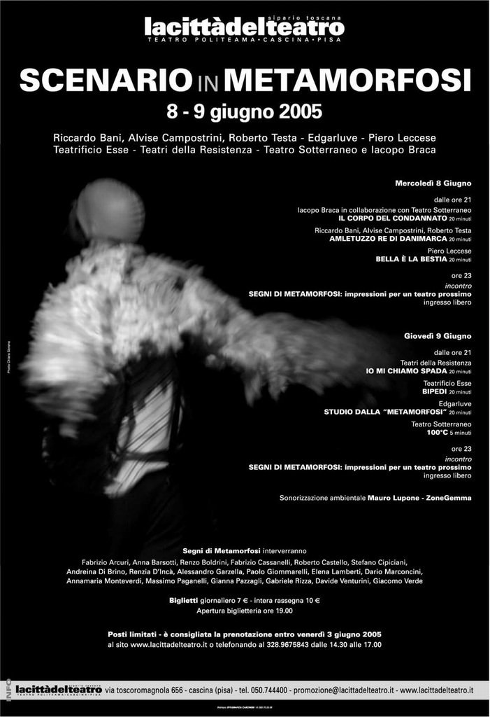 SCENARIO IN METAMORFOSI è uno spazio d'azione per esperienze di nuovo teatro, espressione di un "sommerso" ancor più amplificato dalla scomparsa di luoghi di ascolto e di visibilità alternativi a quelli canonici sempre più appiattiti sul consenso.