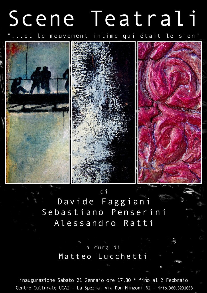 E’ una mostra di esordienti quella che apre i battenti Sabato 21 Gennaio alle ore 17:30 presso il Centro Culturale Ucai di La Spezia. Faggiani, Penserini e Ratti orbitano con il loro giovane stile intorno a questo mondo, rappresentato dalla scena teatrale, che li stimola, li solletica a cavarne fuori delle linee generali, dei frutti del tutto personali che possano nel complesso comunicare una visione di ciò che l’interminabile “impresa” del teatro ha trasmesso loro.
