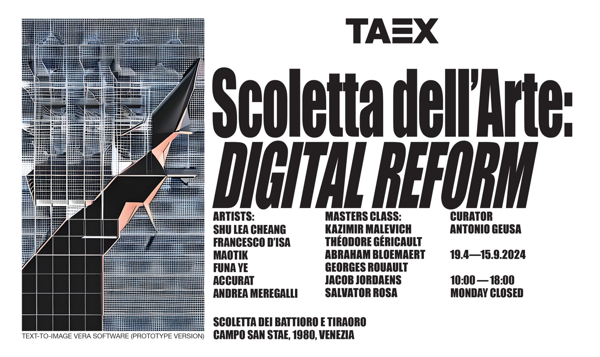 Il progetto espositivo presentato a Venezia, curato dal critico Antonio Geusa, restituisce all’antico edificio della Scoletta il ruolo originale di Scuola d’Arte — fili e foglie d'oro vengono sostituiti da linee di codici e opere audiovisive mentre l’allestimento è strutturato come un percorso di apprendimento innovativo e non convenzionale, finalizzato a conoscere la creazione dell'arte digitale e la sua relazione con la storia dell'arte. Come nelle antiche scuole artigiane, la formazione passa qui attraverso l’esperienza diretta delle opere con le quali è possibile anche interagire, un’opportunità per comprendere meglio il mondo delle nuove tecnologie applicate all’arte e il suo contesto storico.