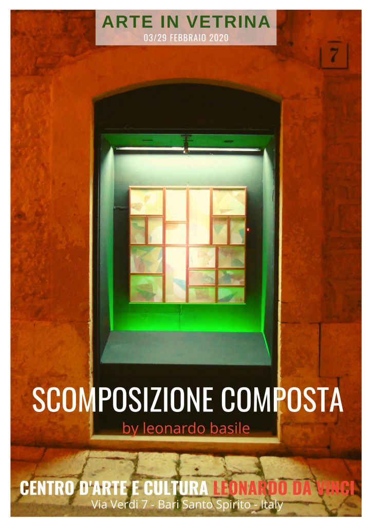 Continua, presso la Vetrina del Centro d'Arte e Cultura 'Leonardo da Vinci' in via Verdi 7 a Bari Santo Spirito, la rassegna ARTE IN VETRINA, che presenta ogni mese un'opera 'da parete' particolarmente interessante. Questo mese è la volta della 'Scomposizione composta' di Leonardo Basile, 'artiere' - come lui preferisce definirsi - in quel di Santo Spirito, ridente o sorridente borgo a mare a nord della città di Bari.