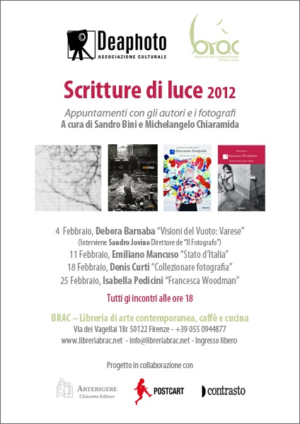 Si apre Sabato 4 Febbraio presso la Libreria Brac (Via dei Vagellai 18r Firenze) la Quarta Edizione della Rassegna “Scritture di Luce”, appuntamenti con gli autori e i fotografi, organizzata dall’Associazione Culturale Deaphoto (www.deaphoto.it) in collaborazione quest’anno con la Libreria Brac e le Case Editrici Arterigere, Postcart e Contrasto. A presentare autori e fotografi, Sandro Bini e Michelangelo Chiaramida curatori del Progetto. Gli appuntamenti si ripeteranno per tutti i sabati del mese di Febbraio sempre alle ore 18. Si inizia il 4 Febbraio con Debora Barnaba che parlerà del suo libro Visioni del vuoto: Varese (Arterigere). A seguire, l’11 Febbraio, Emiliano Mancuso, che presenterà il suo recente volume Stato d’Italia (Postcart) e il 18 Febbraio Denis Curti con Collezionare fotografia (Contrasto) scritto in collaborazione con Sara Dolfi Agostini. Chiude la Rassegna il 25 Febbraio, Isabella Pedicini con il suo libro dedicato al periodo romano di Francesca Woodman (Contrasto). Tutti gli incontri sono a ingresso libero.