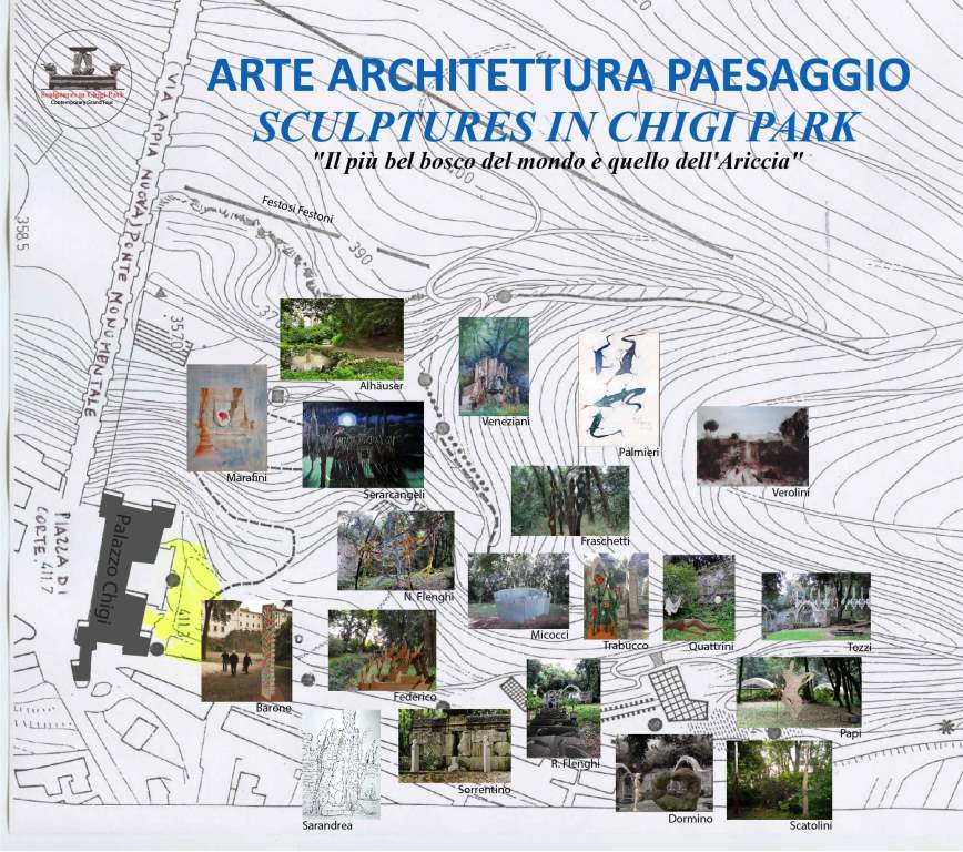 La mostra presenta un ampio repertorio di proposte ideate da artisti di varia formazione con l’esposizione di modelli, bozzetti e progetti ad evidente vocazione plastico-scultorea, animata anche da interventi grafici e pittorici frutto dell’ idea laboratoriale che ha visto nel corso di vari incontri studiosi, storici e artisti in comunicazione. Il Progetto interdisciplinare è ambientato nel “più bel bosco del mondo” (Stendhal) ed è stato pensato all’insegna del “Dialogo tra le Arti”, assunto di matrice berniniana, e all’attenzione relazionale degli artisti desiderosi di ascoltare ed evocare le magie e le suggestioni di un gran teatro della Natura, dell’ Architettura, dell’ Arte, del Mito, e delle rovine. Avventura fascinosa dei nostri tempi, in una ideale continuità con le esperienze e lo spirito dei viaggiatori del “Grand Tour d’Italie”, tra paesaggi incantevoli, natura rigogliosa, memorie artistiche stupefacenti, e “persistenza fisica” ancora oggi di miti e leggende. Quindi “nessuna imitazione” di un grande passato, ancora presente, (dove aleggia lo spirito del Bernini) ma emulazione ed immersione nel voler “sentire” i luoghi nella fascinazione della loro forma loci. Nessuna opera risarcitoria, ne di disseppellimento quindi, ma il sentire con disincanto questi straordinari paesaggi dell’anima che designano e disegnano insieme il senso del “bello reale” e del “bello ideale”, lasciando poi intravedere anche solo attraverso un segnale, un seme, la ricchezza di quella visione: di un paese-paesaggio che si può restituire di getto anche con un gesto “senza nocciolo né corteccia” (Hegel).