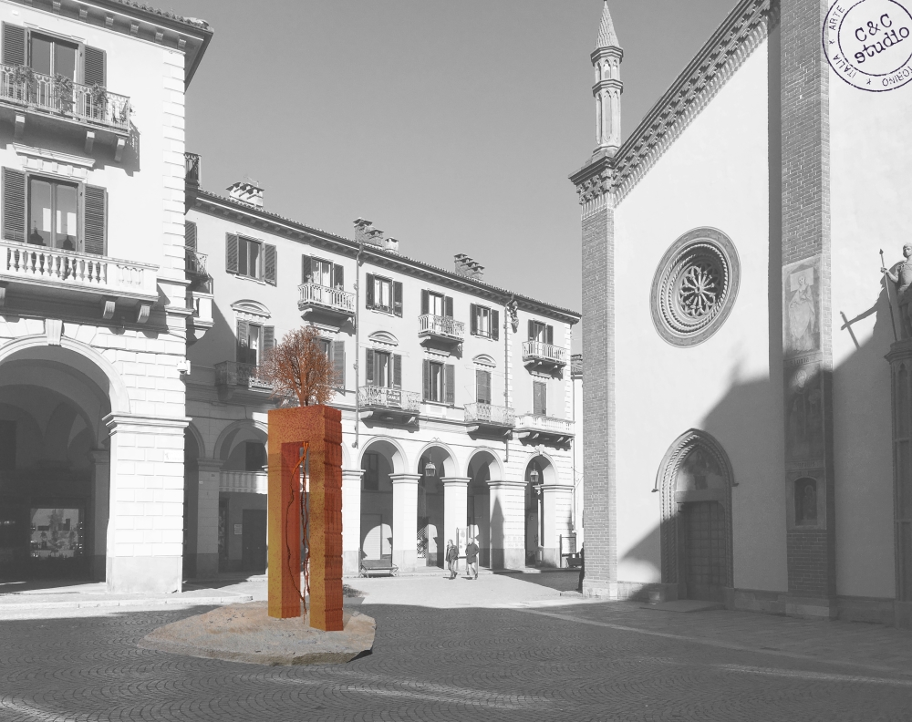 Iniziando il percorso da Piazza Facta, si incontra la prima installazione: Landmark. Dalla pietra di Luserna nasce un albero d'acciaio, ritagliato dal disegno del laser, lavorato dalle tracce ossidate degli elementi atmosferici. Un monumento alla natura creato da un gioco di contrasti: la terra fatta pietra, il legno del tronco fatto acciao, la corteccia evocata dall'ossidazione naturale, il disegno del laser che modella la scultura. L'arte esplora e ricrea la natura, trasformando la materia in una metafora e la metafora in materia. Nello spazio urbano della piazza sorge un richiamo solido e forte all'unione simbolica dell'albero e della pietra, al mondo originario dove la vita stessa si genera come seme che ovunque attecchisce, fa parte della nostra memoria ancestrale e personale, compone il nostro paesaggio interiore che, come scriveva il grande poeta Baudelaire, è "una foresta di simboli". Non materia inerte, ma presenza viva che occupa per un momento il passaggio e il passeggio quotidiani, aprendo una nuova dimensione percettiva dello spazio abituale, al quale non facciamo più caso, ma che ambienta sempre le nostre azioni. Spostandosi verso Piazza Verdi, appare Attraversamento, un'opera che è stata acquisita dall'amministrazione comunale e resterà permanente. Il muro cieco del Teatro Sociale, su cui è montata, prende vita. Alberi con i colori autunnali, generati dall'ossidazione naturale dell'acciaio, emergono alla luce della piazza antistante, si affacciano al pubblico dei passanti offrendo loro un dialogo senza parole. Gli alberi sono abbattuti dall'uomo per necessità e purtroppo anche per speculazione, sono l'ossigeno del pianeta eppure l'uomo contemporaneo, che vive prevalentemente in spazi urbani e artificiali, dimentica di respirare grazie ad essi. Ma l'albero risorge sempre, ovunque, dalle macerie e dall'asfalto, dalle strade e dai muri. Al seme, che viaggia col vento, basta una piccola fessura, un minuscolo spiraglio, per infilarsi e rispuntare in forma di pianta, segno di una rigenerazione costante, di una resistenza vitale, lenta, silenziosa e pacifica. Gli alberi che escono dalla parete cieca del teatro portano sulla scena della strada la rappresentazione simbolica della crescita, inaspettata e sorprendente, che spiazza la piazza, trasformandola in un luogo utopico, dove l'arte intreccia sapientemente natura e cultura. Passando in Via Trento bisogna sollevare lo sguardo per vedere l'Equilibrista. Le case possono essere unite dai fili dei panni stesi come nei vecchi quartieri e paesi del meridione, oppure mettere rami come gli alberi cercando sponde a cui legarsi. Così hanno immaginato Abbaldo e Albertelli, per creare ponti e attraversamenti nella geometria troppo regolare delle strade urbane. Su un cammino sottile che è come una lama vegetale sospesa nel vuoto, appare la figura di un funambulo ritagliata nel vuoto. Un equilibrio delicato e precario che comunica ai passanti quanto sia importante essere sensibili e consapevoli per non cadere. Le sue piccole dimensioni lo fanno sembrare molto lontano, una creatura che sta tra cielo e terra, che percorre spazi infiniti nei limiti costruiti dalle pareti dei palazzi. "Io cammino fino al mio limite" diceva il grande alpinista Messner, ma è proprio camminando che la meta si sposta, che i limiti si superano e i confini si dissolvono. Così l'intervento dell'arte ridisegna l'ambiente, rende dinamico ciò che sembra fisso, rende flessibile ciò che sembra rigido, rende aperto ciò che sembra chiuso, unisce ciò che sembra separato. Giunti a Piazza San Donato, appare maestoso Il portale. Quest'opera, realizzata con acciao corten tagliato al laser e ossidato, su base di pietra di Luserna, è liberamente ispirata alla celebre Torre Guinigi di Lucca, trecentesca, alta oltre 44 metri, fatta di mattoni e pietre e culminante sulla sua cima in un suggestivo giardino pensile che ospita sette alberi (lecci). Per i signori di Lucca che l'hanno costruita, e poi per tutta la città toscana, questa singolare combinazione di architettura e natura, proiettata verso il cielo, era simbolo di rinascita. Un'idea che attraversa tutta l'opera di Abbaldo e Albertelli, architetti e artisti, capaci di solide costruzioni ed insieme di fantasie visionarie. Sulla base di un grande masso orizzontale di Luserna alto circa 20 centimetri, ricavato da una spaccatura naturale della roccia, gli scultori torinesi hanno eretto la loro torre, composta da due colonne di lame d'acciao corten saldate insieme e poi ossidate naturalmente, evocando il colore caldo del mattone. In cima domina l'albero come un re, albero simbolico della vita, acciaio ritagliato dalla tecnologia moderna del laser con la finezza dell'artista-orefice antico. La torre è anche una soglia, un portale che rivela al suo interno, come in una trasparenza ideale, la sua lunga radice, anima profonda dell'albero e, secondo le attuali ricerche neurobotaniche, sede dell'intelligenza vegetale. E quella radice pare viva, è resa viva dalla visione dell'arte, capace appunto di svelare ciò che è nascosto per offrirlo agli occhi del suo pubblico. Il tragitto della Biennale di Scultura diffusa si conclude in Piazza Santa Croce, con l'opera più metafisica: Fede, realizzata in bronzo tagliato al laser e ossidato, montato su torre in ardesia. L'obelisco, di origine egiziana e ripreso dai romani, è stato il primo grande monumento metafisico astratto della storia religiosa e artistica: dedicato al Dio Sole era una lancia innalzata al cielo, un ponte ideale tra cielo e terra, un raggio di pietra. Nell'obelisco creato da Abbaldo e Albertelli, con pregiata roccia di ardesia, in cima al quale sorge una quercia in bronzo ossidato, il monumento rivive come una "fede" nuova e antica nello stesso tempo, quella nell'albero, inteso come simbolo della Natura stessa, ciclo vitale di rigenerazione (la quercia è un albero particolarmente robusto, maestoso e longevo, considerato albero sacro di lunga vita presso molti po