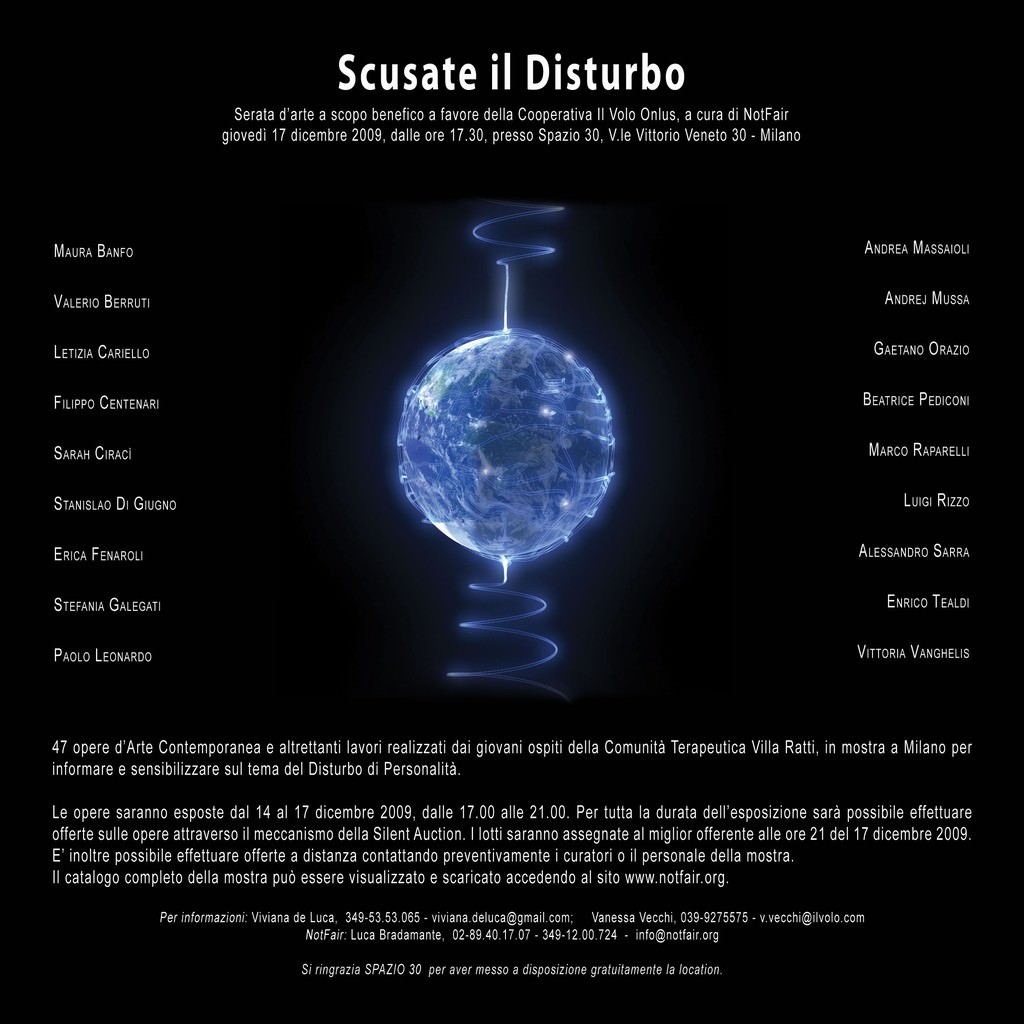I curatori di NotFair e il Volo Onlus presentano la prima edizione della mostra d’arte contemporanea “Scusate il Disturbo”, che avrà luogo dal 14 al 17 dicembre presso Spazio 30 a Milano, dalle 17 alle 21.