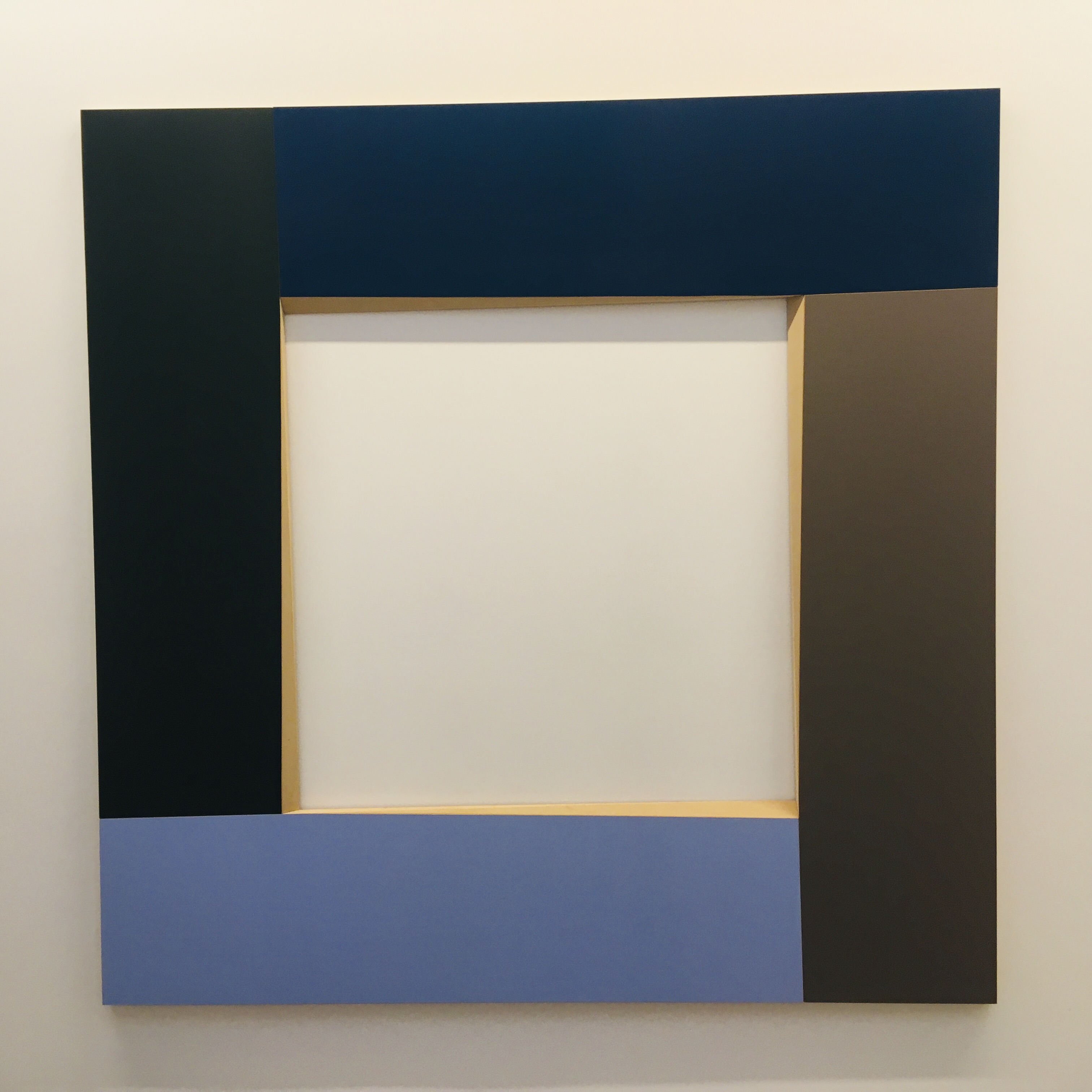 I bordi tagliati e bisellati in modo da esibire il supporto, insidiano la fissità geometrica delle superfici, contribuiscono a conferire ai colori una solidità compatta e tagliente, simile a quella di pietre preziose, senza rifletterne però la luce.