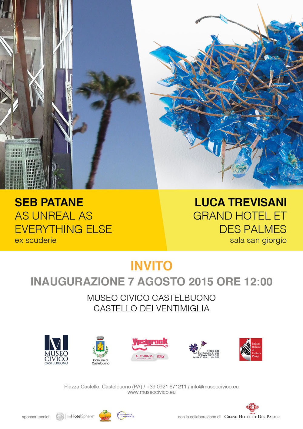 Il Museo Civico di Castelbuono, in occasione del Ypsigrock Festival 2015, è lieto di presentare le due mostre As unreal as everything else di Seb Patane e Grand Hotel ed des Palmes di Luca Trevisani in collaborazione con l’Istituto Italiano di Cultura di Parigi e il Museo Naturalistico Francesco Minà Palumbo di Castelbuono, a cura di Laura Barreca e Valentina Bruschi.