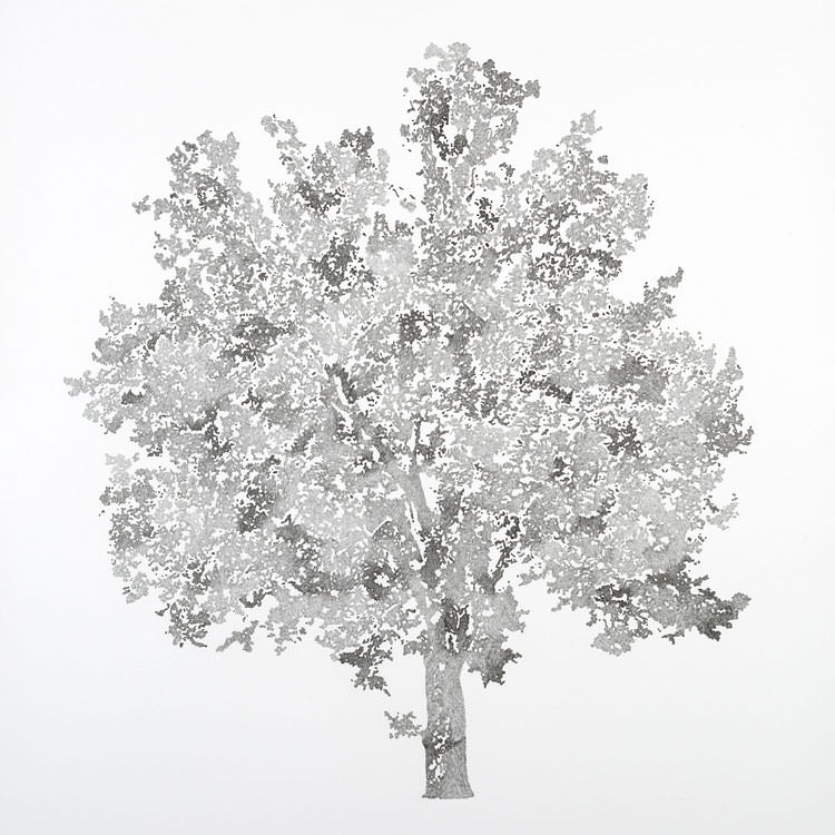 His trees are living, not vegetating, without being intrusive. Oak, beech, chestnut, walnut, birch, hornbeam, and many others. Breathing forces with no frills in which color is not expected. Blank sheet, black pencil. Austerity in a play of solids and voids. Wise and still, the trees develop into an image of a time crystallized by the artist's hand. Trees as a metaphor of poetry that rejects the superfluous and revolves in a central synthesis. An inherent poetry that emancipates for the occasion in the words of the poet Franca Mancinelli, rhymes as fellow travelers crawling among the branches caressing them intimately.