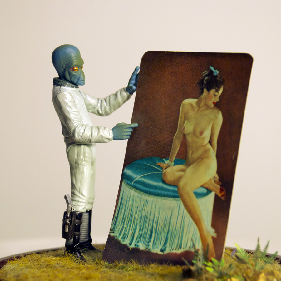 La prima, Aliens, è composta da una ventina di piccole sculture sotto una campana di vetro, in cui una statuetta di un alieno si misura con la vecchia foto di un ritratto, dando vita a una dialettica di universi e significati, ad un intreccio sotteso di riferimenti in cui ritrovarsi e perdersi, a conferma che spesso nel diverso c’è una parte di noi.