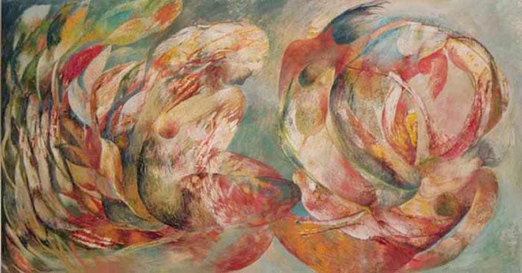 Da un mondo fantastico di impasti cromatici emergono forme improvvise, figure fluttuanti che si adagiano, si sovrappongono, si dissolvono nella luce per poi di nuovo intrecciarsi in morbidi vortici di linee e colori.