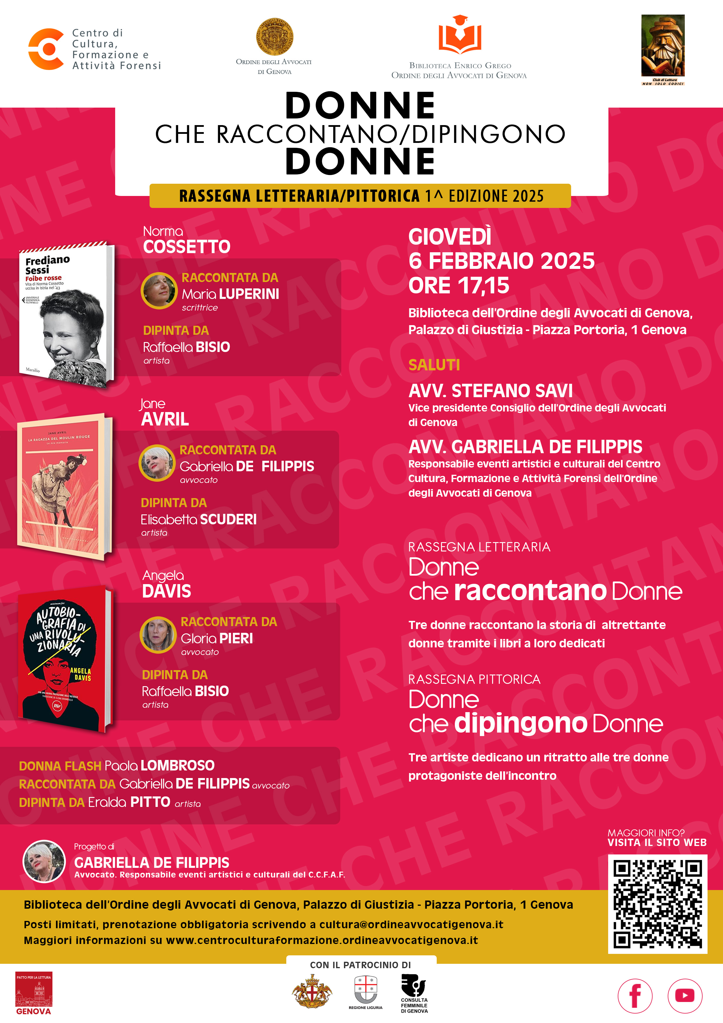 Per quanto riguarda più specificatamente l’incontro del prossimo 6 febbraio , che, come si è detto, si terrà nei locali della Biblioteca E. Grego , sita all’interno dell’Ordine degli Avvocati di Genova, a sua volta ubicata dentro Palazzo di Giustizia, in Piazza Portoria 1, alle ore 17,15 le tre professioniste che presenteranno la biografia delle donne famose scelte per questa occasione saranno Maria Luperini, scrittrice, già direttore della Corte di Appello di Genova, che parlerà di Norma Cossetto, studentessa istriana e vittima dei partigiani jugoslavi nel 1943, Gabriella de Filippis, avvocato, che ci racconterà la vita di Jane Avril, nota stella del Moulin Rouge, spesso ritratta dal pittore Toulouse- Lautrec e infine Gloria Pieri, avvocato, che ci parlerà di Angela Davis, nota attivista del movimento afroamericano statunitense.