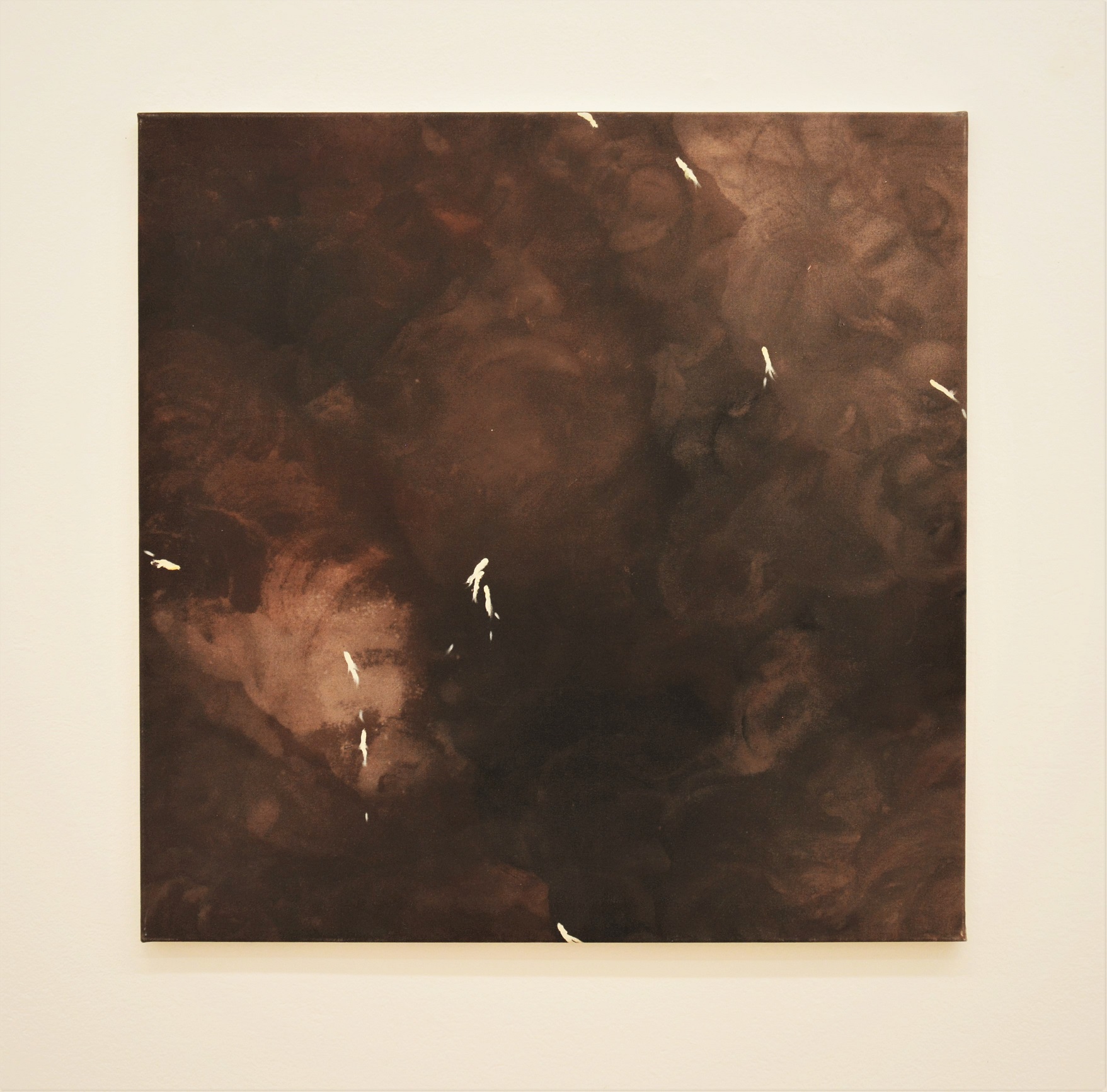 Accade allora, come in Senza titolo (2011), che l’orizzonte si schiacci fino alla base della tela, producendo un esile profilo montano nel quale si rispecchia una veduta cara all’artista, il resto della superficie rimane privo di pigmento occupato da una griglia che suddivide lo spazio come a prefigurare un’ipotetica composizione futura. Le uniche forme che invadono lo schema sul lato destro sono molli, penzolanti, arcuate. Ricordano in qualche modo gli 11 cetacei (2006), guizzi di acrilico bianco che si muovono liberi su una campitura acquosa che riempie lo spazio del quadro come una texture. Tra le due opere si impone un repentino cambio del punto di vista, dalla frontalità delle sagome alpine si trasla ad una veduta marina aerea, a volo d’uccello, per poi innalzarsi ancora verso una distasa zenitale in Finis Terrae (2017). Si fa luce l’idea di una mappa, la traccia di una Pangea in espansione che cerca collocazione soppiantando il vuoto, conquistando centimetri attraverso l’alternanza di fragili lingue e fiordi discontinui.