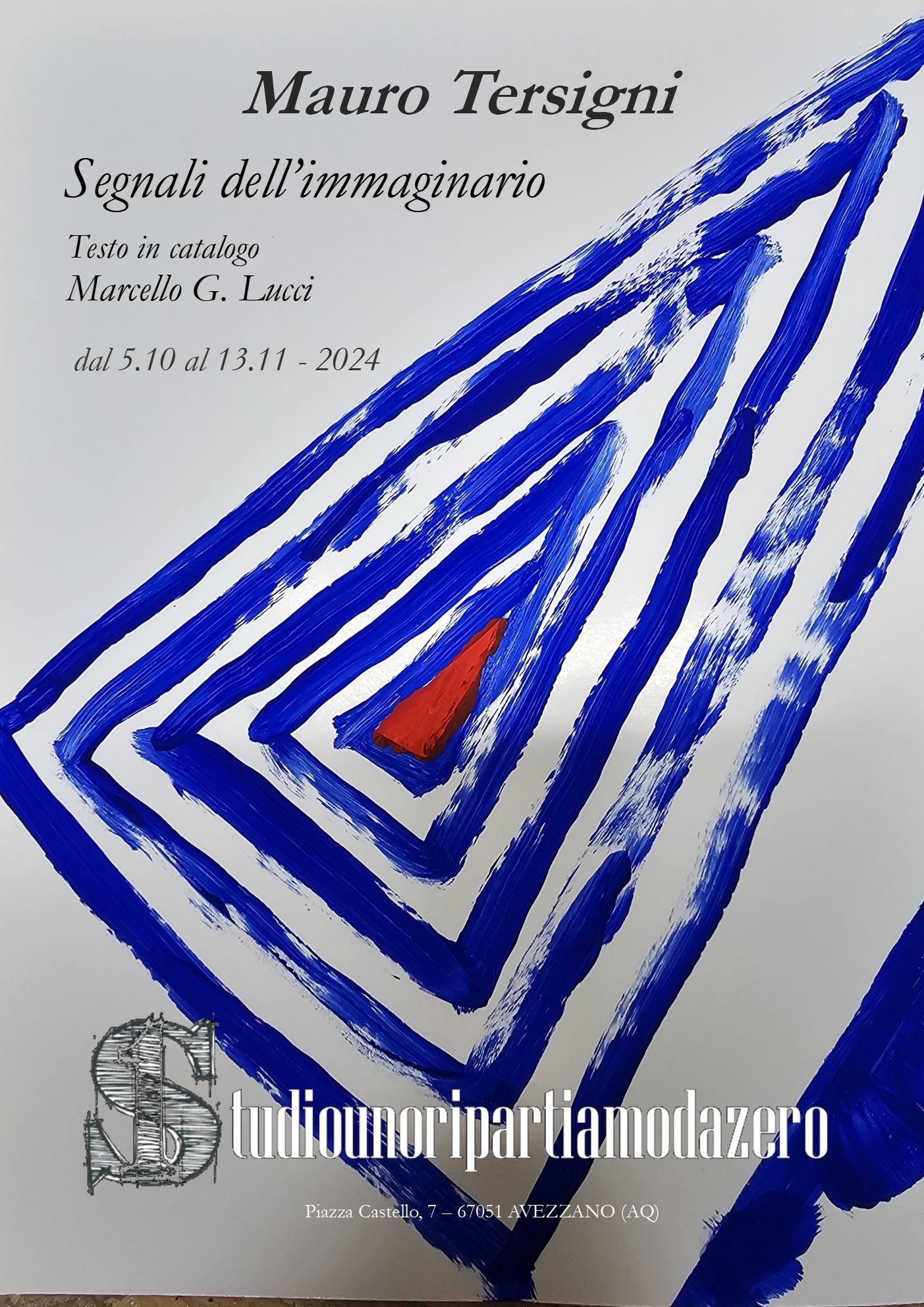 Il giorno 5 ottobre 2024 alle ore 18,00 Vernissage della Mostra Segnali dell’immaginario opere dell’artista Mauro Tersigni a cura e testo in catalogo di Marcello G. Lucci, il catalogo sarà presentato e distribuito ai presenti il giorno dell’apertura della mostra il 5 ottobre