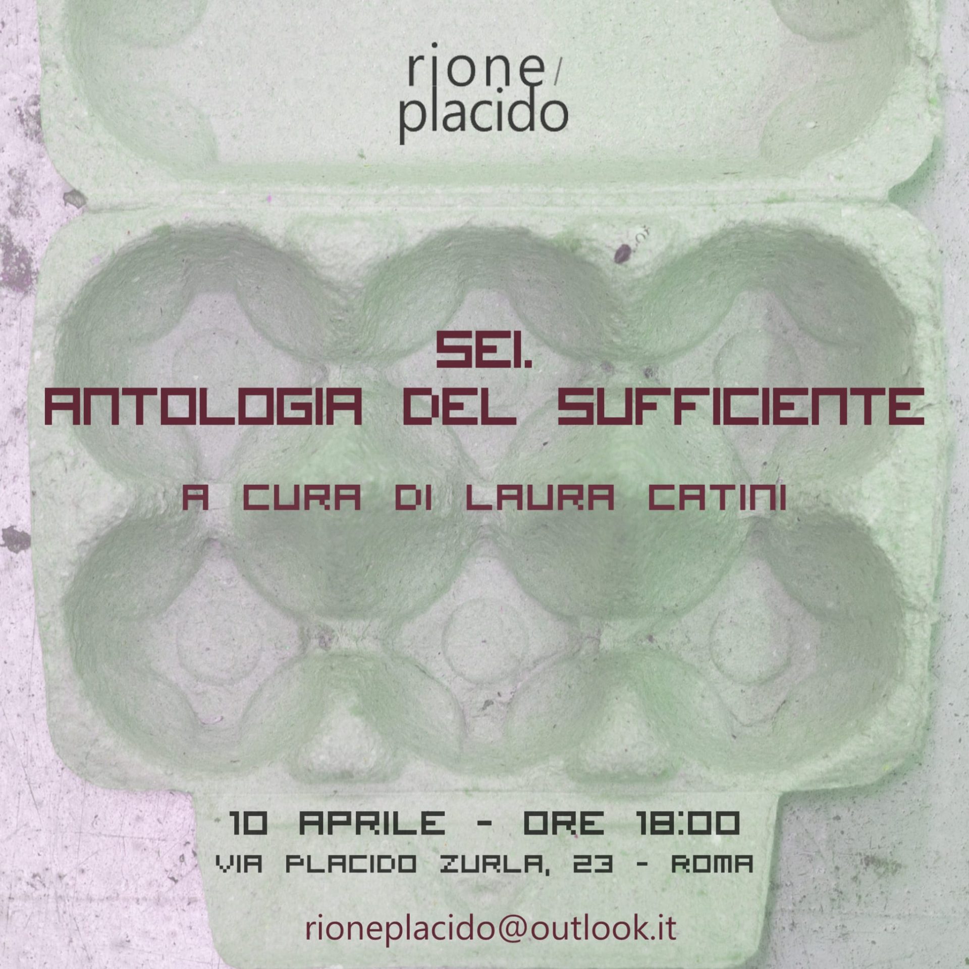 Il 10 aprile, alle ore 18, in via Placido Zurla, 23, inaugura l’open studio SEI. ANTOLOGIA DEL SUFFICIENTE dell’Artist Run Space romano Rione Placido, con i lavori dei sei artisti fondatori Eleonora Bona, Alice Colacione, Tiziano Conte, Denise Montresor, Mattia Cleri Polidori e Paolo Vitale, e con la curatela e il testo critico di Laura Catini.