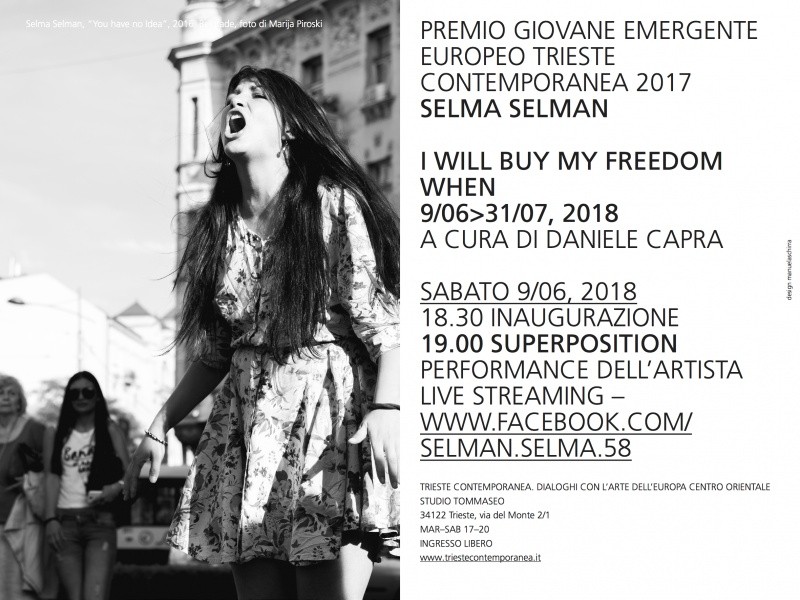 Sabato 9 giugno alle 18.30 presso lo Studio Tommaseo sarà inaugurata la personale I will buy my freedom when di Selma Selman, vincitrice del Premio Giovane Emergente Europeo Trieste Contemporanea 2017. Seguirà alle 19.00 la performance dell’artista Superposition, che sarà visibile anche in diretta streaming su Facebook. La mostra, curata da Daniele Capra, raccoglie una decina di opere recenti che spaziano da video a lavori su carta, fino ad opere di natura concettuale appositamente realizzate per lo spazio triestino.