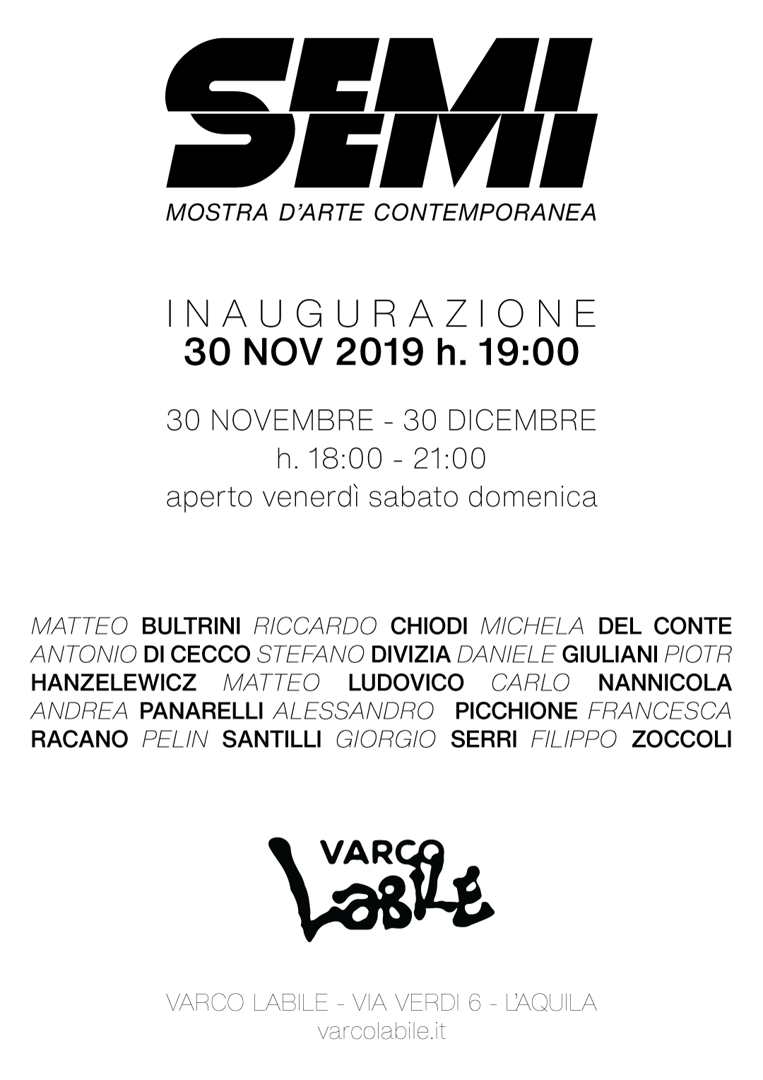Varco Labile ha il piacere di presentare la sua seconda iniziativa pubblica: dopo la rassegna di videoarte “Specchio riflesso - Uno sguardo nell'interno o viceversa” è la volta di “SEMI” una mostra d'arte contemporanea creata da 15 artisti che vivono e convivono con il territorio aquilano.