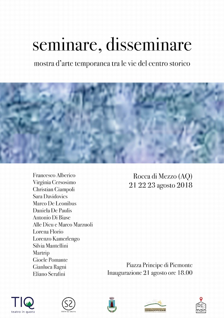 Nella cornice del borgo di Rocca di Mezzo, la mostra collettiva "seminare, disseminare" si propone come motivo di scoperta dell'antico paese, per l'occasione costellato da interventi temporanei. Vicoli, piazze e giardini saranno il contesto con cui si confronteranno diversi linguaggi e visioni, segmenti di ricerche e sviluppi di mondi personali, plasmati con molteplici ed originali approcci. Espressioni che si consolidano, così come un paese si definisce attorno ad un centro ed evolve in modo irregolare, seguendo una logica propria. Seminare e disseminare come possibili termini per descrivere i processi e le evoluzioni, le bonacce e le bufere, le azioni ed i gesti dell'arte e della vita.