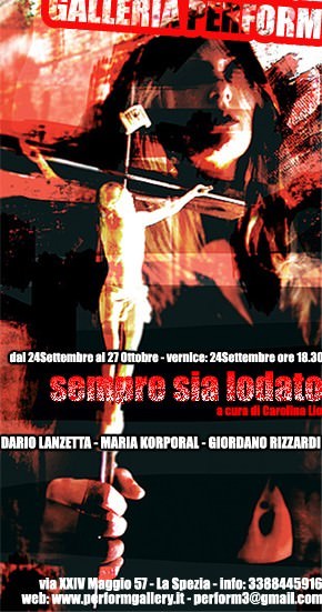 L'immagine che abbiamo scelto per introdurre questa mostra è una giovane donna immersa in un'atmosfera color rosso sangue che stringe e mostra con aria decisa un crocifisso. E' ostentato come simbolo di uno status scomodo, ribelle, inquieto, attivo e reazionario. E' il simbolo di una religione travestita da anarchia, con tonalità agli antipodi dei soliti colori sereni, pacati, confortevoli e trasfigurati delle raffigurazioni tradizionali. I tre artisti della mostra Sempre sia lodato vedono, infatti, nella visione consolatoria della religione un sogno sorpassato e troppo debole per poter resistere ancora oggi. Nel mondo, diventato luogo di violenza, non ci si può più solo affidare alla speranza e confidare nell'attesa. Come ci mostra Maria Korporal nel suo video Made on Earth, i valori contemporanei fondamentali (bene e male, vita e morte) sono confusi e invertiti. L'artista utilizza come protagonista rilevatrice la pietra. Nel mito di Deucalione e Pirra, unici umani scampati a una catrastrofe, la pietra è il modo in cui Dio ricostruisce l'umanità: ogni sasso che i due sopravvissuti buttano alle loro spalle si trasforma in un essere umano. Oggi da una pietra scagliata non possiamo che aspettarci un indizio di guerra, di morte e in sostanza di male. Un male che ci separa inevitabilmente gli uni dagli altri e che si abbatte sopra di noi, in un'immagine del video, come un sasso che ci piomba addosso in una foresta disabitata. Da questo isolamento psicologico, di paura dell'altro, di sfiducia e di chiusura ermetica dei propri sentimenti, non sfuggirebbe neanche un Cristo contemporaneo, come quello immaginato da Giordano Rizzardi. Nel suo trittico esposto, il Cristo di oggi è un uomo dallo sguardo disilluso che beve vino da solo a un tavolo di plexiglass con sopra pane tagliato a fette e del pesce ancora congelato e sottovuoto. Gira la testa prima da un lato e poi da un altro, ma non vede nessun altro che se stesso. Il discorso raggiunge il suo apice nel lavoro di Dario Lanzetta che tramite rielaborazioni digitali di autoscatti diventa lui stesso Cristo, marchiato dai segni della croce, con gli occhi vuoti, dolorante e addirittura suicida. Cristo diventa una sovversione sofferente, un simbolo di lotta e di reazione, di ultima tenace e disperata resistenza all'invasione di questo rosso tremendo e maligno che conquista sempre più spazio nelle opere e che lotta con il colore giallo di cui Cristo è circondato, che piano piano sparisce e sempre più quando più la sua espressione esprime dolore e terrore.