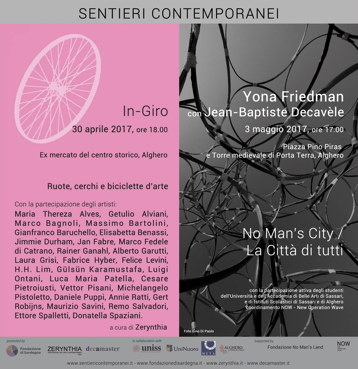 Ad Alghero 28 artisti per “In-Giro”, mostra che si ispira al Giro d’Italia, quest’anno alla centesima edizione. In contemporanea, “No Man’s City” di Yona Friedman con Jean-Baptiste Decavèle, 400 cerchi di legno si combinano in un’architettura mobile, che si adatta al paesaggio sardo.