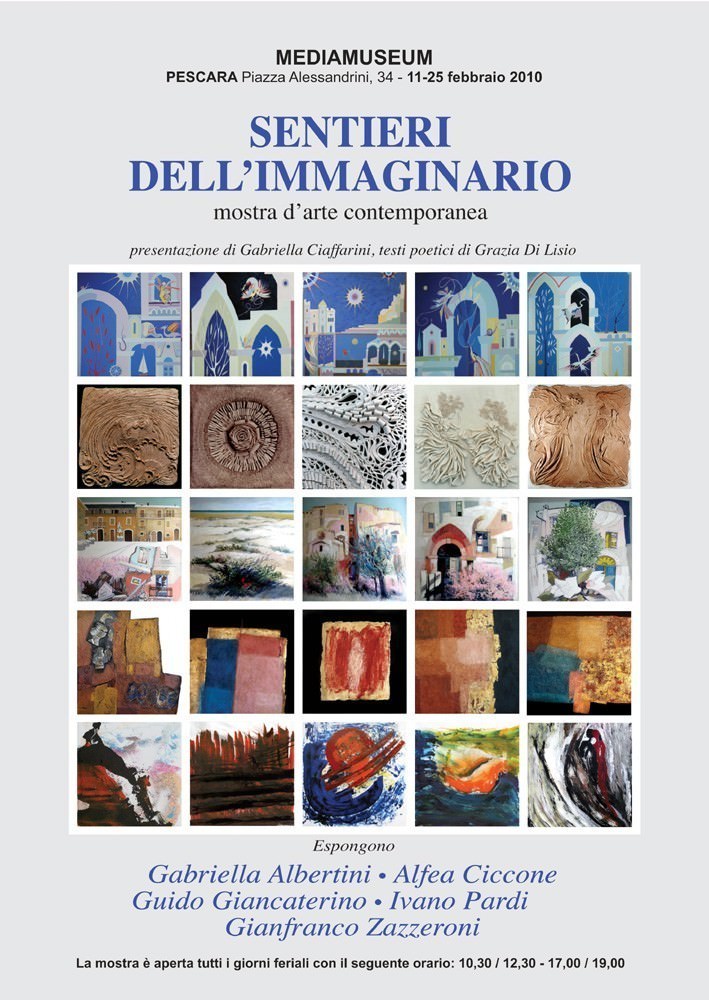 Il sentiero è un percorso stretto, a volte impervio, altre agevole o imprevedibile, che viene a formarsi quasi spontaneamente per il ripetuto e persistente passaggio dell’uomo o di altro essere vivente.L’immaginazione è la facoltà di elaborare liberamente e con fantasia i dati dell’esperienza sensibile e del pensiero.Gabriella Ciaffarini, che dedica a ogni espositore un giudizio critico, all’inizio della presentazione scrive: Un titolo suggestivo per una mostra che regala emozioni e che permette al visitatore di aprire tutti i registri della memoria, della fantasia ed anche dei sogni. Mentre alla fine si legge: L’itinerario artistico ci guida così di volta in volta dentro e fuori di noi, ci porta ad osservare con occhi diversi il tempo della storia ed a scoprire la grandezza dell’adesso, ci spinge a cesellare di nuovo i congegni meravigliosi dell’immaginazione per riplasmare il mondo reale secondo la nostra interiorità. Il catalogo, con i riferimenti essenziali, contiene, inoltre, l’interpretazione poetica che Grazia Di Lisio ha espresso per l’emozione provata nell’osservare i colori, i rilievi e le composizioni dei suoi amici autori.