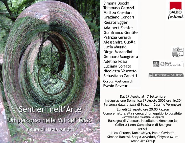 Sentieri dell’arte vuole essere un momento di riflessione culturale sul rapporto contemporaneo tra uomo e natura. L’idea è quella di presentare delle opere che si confrontino attivamente con la natua e con il pubblico in un contesto ambientale stimolante come lo è la Valle del Tasso. Dagli ampi e solari spazi verdeggianti della prima parte del percorso, all’interiore flusso della valle con i suoi umori oscuri e tenebrosi, la valle si presenta come un corpo vivo ( che il nostro corpo sia un fiume sapiente è fuor di dubbio. Novalis, Frammenti). La cultura contemporanea in un’idea vincente di sfruttameno totale dei corpi, ha recentemente alterato l’ecosistema trasformando il flusso di acqua da zampillo della memoria che scorre nello spazio, a un flusso talvolta maleodorante e sporco.